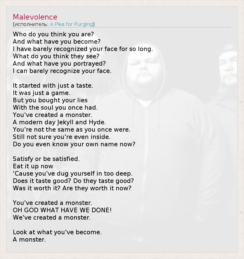 Как вы думаете, вы ? И что вы стали ? Я с трудом узнал ваше лицо так долго. Что вы думаете они видят ? А что ты изобразил ? Я едва могу признать ваше лицо . Все началось с только вкус. Это была просто игра . Но вы купили свою ложь С души вы когда-то . Вы создали монстра . Современный день Джекил и Хайд . Ты не такой, как вы когда-то были . До сих пор не уверен, что ты даже внутри . Вы даже знаете, свое собственное имя сейчас? Удовлетворить или быть удовлетворены. Ешьте его сейчас Потому что вы вырыли себя слишком глубоко . Есть ли вкус? Они имеют приятный вкус ? Стоило ли оно того ? Являются ли они стоят сейчас? Вы создали монстра . О Боже , что мы сделали ! Мы создали монстра . Посмотрите, что вы стали . Монстр .