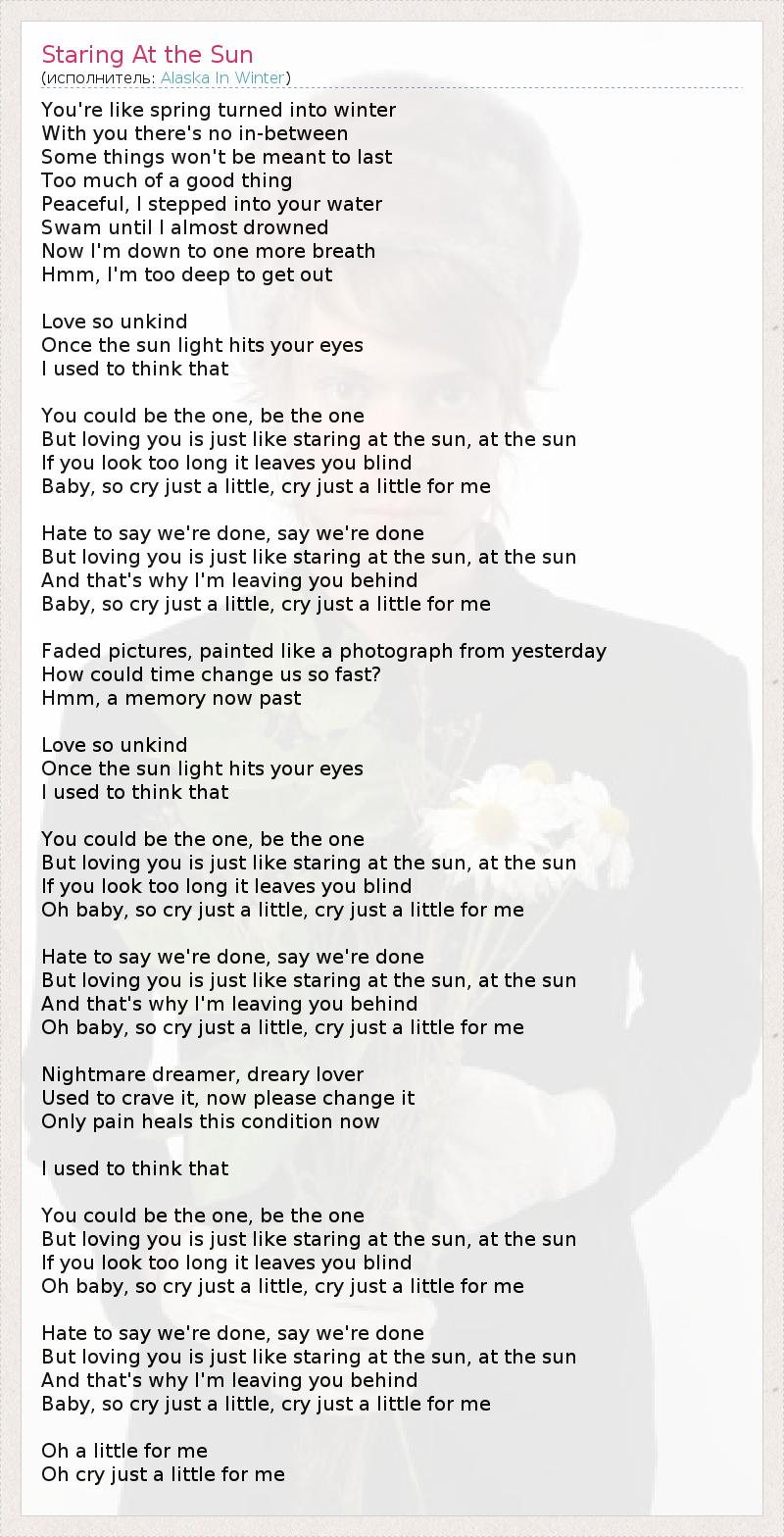 You're like spring turned into winter With you there's no in-between Some things won't be meant to last Too much of a good thing Peaceful, I stepped into your water Swam until I almost drowned Now I'm down to one more breath Hmm, I'm too deep to get out Love so unkind Once the sun light hits your eyes I used to think that You could be the one, be the one But loving you is just like staring at the sun, at the sun If you look too long it leaves you blind Baby, so cry just a little, cry just a little for me Hate to say we're done, say we're done But loving you is just like staring at the sun, at the sun And that's why I'm leaving you behind Baby, so cry just a little, cry just a little for me Faded pictures, painted like a photograph from yesterday How could time change us so fast? Hmm, a memory now past Love so unkind Once the sun light hits your eyes I used to think that You could be the one, be the one But loving you is just like staring at the sun, at the sun If you look too long it leaves you blind Oh baby, so cry just a little, cry just a little for me Hate to say we're done, say we're done But loving you is just like staring at the sun, at the sun And that's why I'm leaving you behind Oh baby, so cry just a little, cry just a little for me Nightmare dreamer, dreary lover Used to crave it, now please change it Only pain heals this condition now I used to think that You could be the one, be the one But loving you is just like staring at the sun, at the sun If you look too long it leaves you blind Oh baby, so cry just a little, cry just a little for me Hate to say we're done, say we're done But loving you is just like staring at the sun, at the sun And that's why I'm leaving you behind Baby, so cry just a little, cry just a little for me Oh a little for me Oh cry just a little for me
