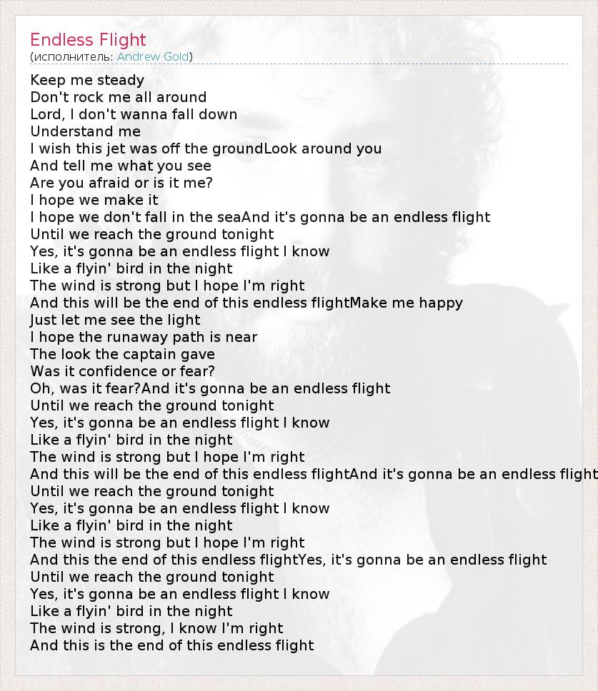 Keep me steady Don't rock me all around Lord, I don't wanna fall down Understand me I wish this jet was off the groundLook around you And tell me what you see Are you afraid or is it me? I hope we make it I hope we don't fall in the seaAnd it's gonna be an endless flight Until we reach the ground tonight Yes, it's gonna be an endless flight I know Like a flyin' bird in the night The wind is strong but I hope I'm right And this will be the end of this endless flightMake me happy Just let me see the light I hope the runaway path is near The look the captain gave Was it confidence or fear? Oh, was it fear?And it's gonna be an endless flight Until we reach the ground tonight Yes, it's gonna be an endless flight I know Like a flyin' bird in the night The wind is strong but I hope I'm right And this will be the end of this endless flightAnd it's gonna be an endless flight Until we reach the ground tonight Yes, it's gonna be an endless flight I know Like a flyin' bird in the night The wind is strong but I hope I'm right And this the end of this endless flightYes, it's gonna be an endless flight Until we reach the ground tonight Yes, it's gonna be an endless flight I know Like a flyin' bird in the night The wind is strong, I know I'm right And this is the end of this endless flight