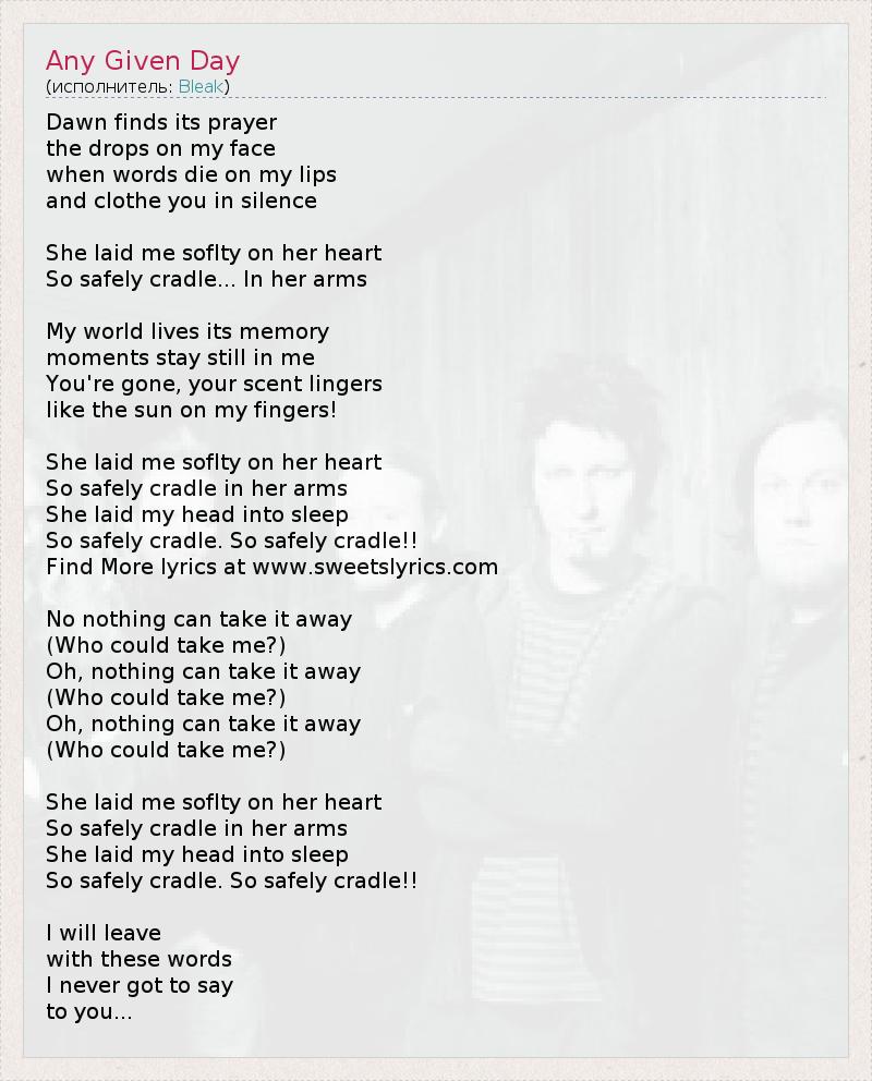 Рассвет находит свое молитву капли на моем лице когда слова умирают на моих губах и одели в тишине Она положила меня soflty на сердце Так что смело колыбель ... В руках Мой мир живет своей памяти моменты оставаться на месте во мне Ты ушел , ваш запах задерживается как солнце на моих пальцах ! Она положила меня soflty на сердце Так что смело колыбели на руках Она положила голову в сон Так что смело колыбели . Так что смело колыбели ! Найти еще лирику www.sweetslyrics.com Нет ничто не может отнять ее ( Кто бы мог взять меня ? ) О, ничто не может отнять ее ( Кто бы мог взять меня ? ) О, ничто не может отнять ее ( Кто бы мог взять меня ? ) Она положила меня soflty на сердце Так что смело колыбели на руках Она положила голову в сон Так что смело колыбели . Так что смело колыбели ! Я оставлю с этими словами Я никогда не получал сказать Вам ...