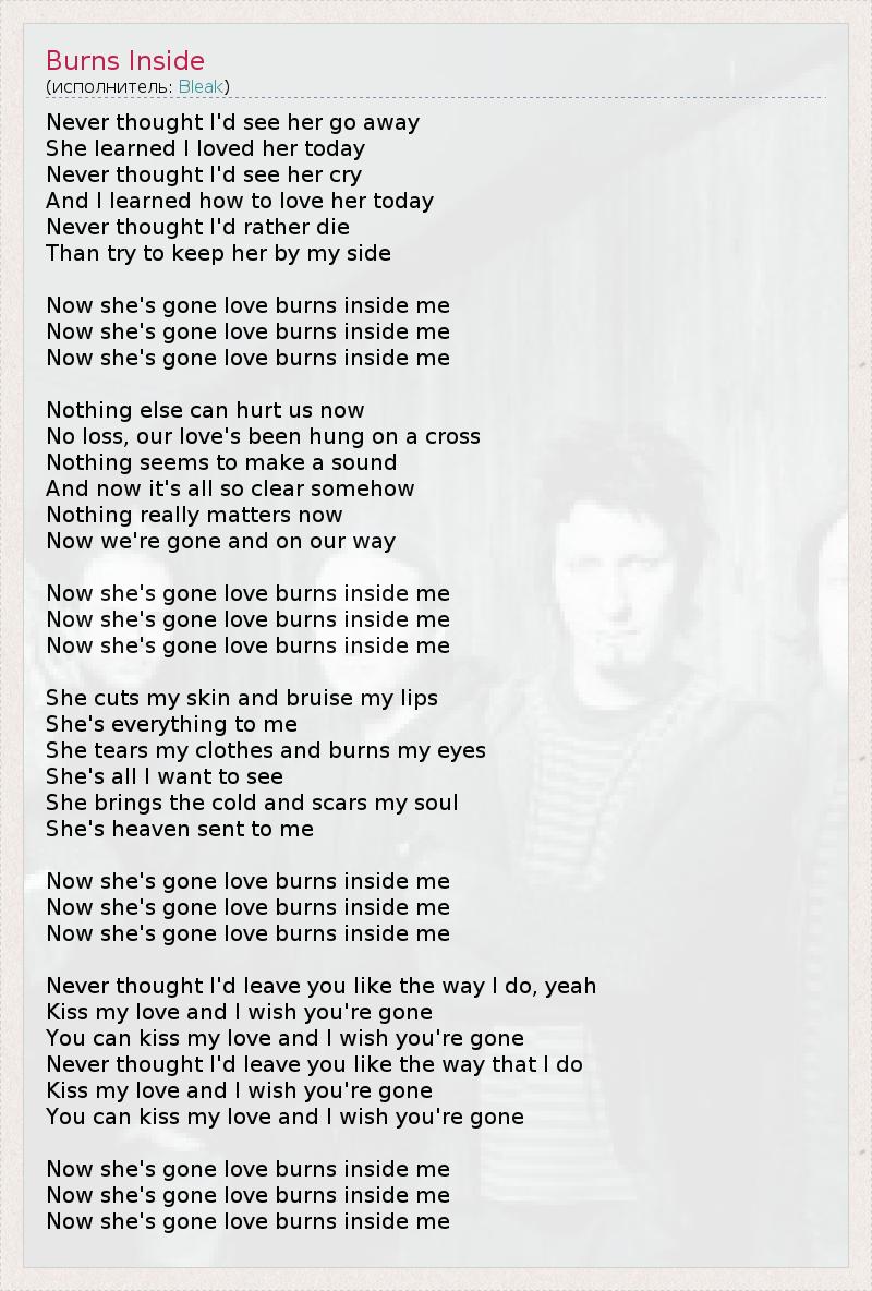 Никогда не думал, что увижу, как она уходит, Сегодня она узнала, что я её любил. Никогда не думал, что увижу, как она плачет, А сегодня узнал, как люблю ее. Никогда не думал, что скорее умру, Чем попытаюсь удержать ее рядом с собой... Теперь она ушла, любовь сжигает меня изнутри, Теперь она ушла, любовь сжигает меня изнутри, Теперь она ушла, любовь сжигает меня изнутри... Нам уже ничто не может навредить, Нет потерь, наша любовь висит на кресте. Кажется, что звуков больше нет, И теперь все стало очевидно. Ничто уже действительно не важно, И мы ушли - каждый по своему пути. Теперь она ушла, любовь сжигает меня изнутри, Теперь она ушла, любовь сжигает меня изнутри, Теперь она ушла, любовь сжигает меня изнутри... Она режет мою кожу и разбивает губы, Она для меня все. Она рвет мою одежду и выжигает глаза, Она все, что я хочу видеть. Она приносит холод и оставляет шрамы в моей душе, Она послана мне небом... Теперь она ушла, любовь сжигает меня изнутри, Теперь она ушла, любовь сжигает меня изнутри, Теперь она ушла, любовь сжигает меня изнутри... Никогда не думал, что брошу тебя так, да, Поцелуй, моя любовь, и уходи, Поцелуй, моя любовь, и уходи. Никогда не думал, что брошу тебя так, да, Поцелуй, моя любовь, и уходи, Поцелуй, моя любовь, и уходи... Теперь она ушла, любовь сжигает меня изнутри, Теперь она ушла, любовь сжигает меня изнутри, Теперь она ушла, любовь сжигает меня изнутри...