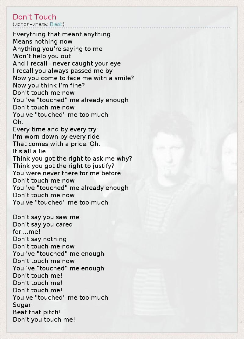 Everything that meant anything Means nothing now Anything you're saying to me Won't help you out And I recall I never caught your eye I recall you always passed me by Now you come to face me with a smile? Now you think I'm fine? Don't touch me now You 've "touched" me already enough Don't touch me now You've "touched" me too much Oh. Every time and by every try I'm worn down by every ride That comes with a price. Oh. It's all a lie Think you got the right to ask me why? Think you got the right to justify? You were never there for me before Don't touch me now You 've "touched" me already enough Don't touch me now You've "touched" me too much Don't say you saw me Don't say you cared for....me! Don't say nothing! Don't touch me now You 've "touched" me enough Don't touch me now You 've "touched" me enough Don't touch me! Don't touch me! Don't touch me! You've "touched" me too much Sugar! Beat that pitch! Don't you touch me!