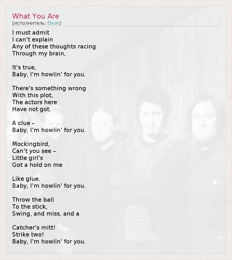 Должен признаться: Я не могу объяснить Ни одну из мыслей, что мечутся У меня в голове. Это правда, Крошка, я вою по тебе. Что-то не так С этим сюжетом, Актёры Не поняли его. Подсказка: Крошка, я вою по тебе. Пересмешник, Разве ты не видишь — Малышка Крепко держит меня, Как клей. Крошка, я вою по тебе. Брось мяч Отбивающему, Замахнись, промахнись, и Прямо в перчатку! Второе нарушение! Крошка, я вою по тебе.