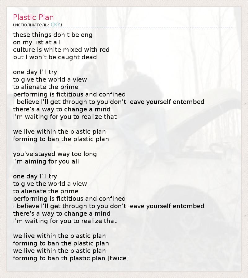 these things don't belong on my list at all culture is white mixed with red but I won't be caught dead one day I'll try to give the world a view to alienate the prime performing is fictitious and confined I believe I'll get through to you don't leave yourself entombed there's a way to change a mind I'm waiting for you to realize that we live within the plastic plan forming to ban the plastic plan you've stayed way too long I'm aiming for you all one day I'll try to give the world a view to alienate the prime performing is fictitious and confined I believe I'll get through to you don't leave yourself entombed there's a way to change a mind I'm waiting for you to realize that we live within the plastic plan forming to ban the plastic plan we live within the plastic plan forming to ban th plastic plan [twice]