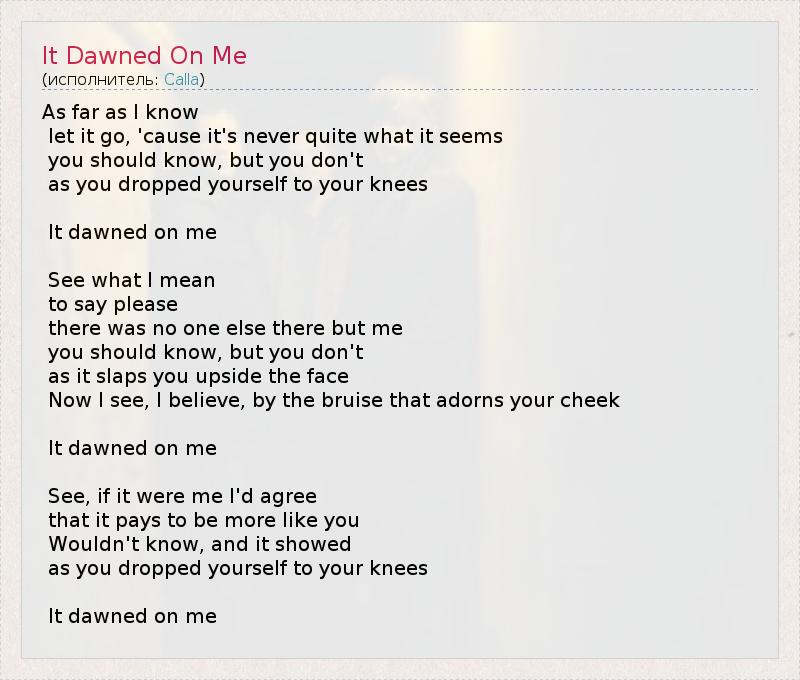 As far as I know let it go, 'cause it's never quite what it seems you should know, but you don't as you dropped yourself to your knees It dawned on me See what I mean to say please there was no one else there but me you should know, but you don't as it slaps you upside the face Now I see, I believe, by the bruise that adorns your cheek It dawned on me See, if it were me I'd agree that it pays to be more like you Wouldn't know, and it showed as you dropped yourself to your knees It dawned on me
