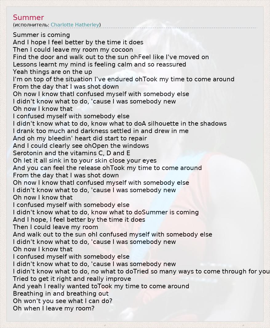 Summer is coming And I hope I feel better by the time it does Then I could leave my room my cocoon Find the door and walk out to the sun ohFeel like I've moved on Lessons learnt my mind is feeling calm and so reassured Yeah things are on the up I'm on top of the situation I've endured ohTook my time to come around From the day that I was shot down Oh now I know thatI confused myself with somebody else I didn't know what to do, 'cause I was somebody new Oh now I know that I confused myself with somebody else I didn't know what to do, know what to doA silhouette in the shadows I drank too much and darkness settled in and drew in me And oh my bleedin' heart did start to repair And I could clearly see ohOpen the windows Serotonin and the vitamins C, D and E Oh let it all sink in to your skin close your eyes And you can feel the release ohTook my time to come around From the day that I was shot down Oh now I know thatI confused myself with somebody else I didn't know what to do, 'cause I was somebody new Oh now I know that I confused myself with somebody else I didn't know what to do, know what to doSummer is coming And I hope, I feel better by the time it does Then I could leave my room And walk out to the sun ohI confused myself with somebody else I didn't know what to do, 'cause I was somebody new Oh now I know that I confused myself with somebody else I didn't know what to do, 'cause I was somebody new I didn't know what to do, no what to doTried so many ways to come through for you Tried to get it right and really improve And yeah I really wanted toTook my time to come around Breathing in and breathing out Oh won't you see what I can do? Oh when I leave my room?