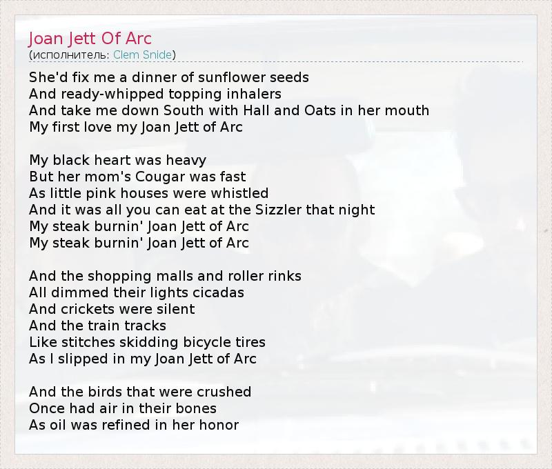 She'd fix me a dinner of sunflower seeds And ready-whipped topping inhalers And take me down South with Hall and Oats in her mouth My first love my Joan Jett of Arc My black heart was heavy But her mom's Cougar was fast As little pink houses were whistled And it was all you can eat at the Sizzler that night My steak burnin' Joan Jett of Arc My steak burnin' Joan Jett of Arc And the shopping malls and roller rinks All dimmed their lights cicadas And crickets were silent And the train tracks Like stitches skidding bicycle tires As I slipped in my Joan Jett of Arc And the birds that were crushed Once had air in their bones As oil was refined in her honor