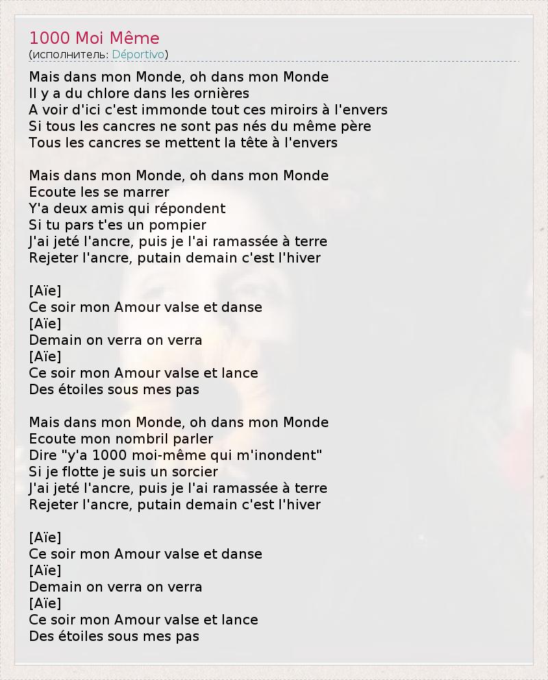 Mais dans mon Monde, oh dans mon Monde Il y a du chlore dans les ornières A voir d'ici c'est immonde tout ces miroirs à l'envers Si tous les cancres ne sont pas nés du même père Tous les cancres se mettent la tête à l'envers Mais dans mon Monde, oh dans mon Monde Ecoute les se marrer Y'a deux amis qui répondent Si tu pars t'es un pompier J'ai jeté l'ancre, puis je l'ai ramassée à terre Rejeter l'ancre, putain demain c'est l'hiver [Aïe] Ce soir mon Amour valse et danse [Aïe] Demain on verra on verra [Aïe] Ce soir mon Amour valse et lance Des étoiles sous mes pas Mais dans mon Monde, oh dans mon Monde Ecoute mon nombril parler Dire "y'a 1000 moi-même qui m'inondent" Si je flotte je suis un sorcier J'ai jeté l'ancre, puis je l'ai ramassée à terre Rejeter l'ancre, putain demain c'est l'hiver [Aïe] Ce soir mon Amour valse et danse [Aïe] Demain on verra on verra [Aïe] Ce soir mon Amour valse et lance Des étoiles sous mes pas