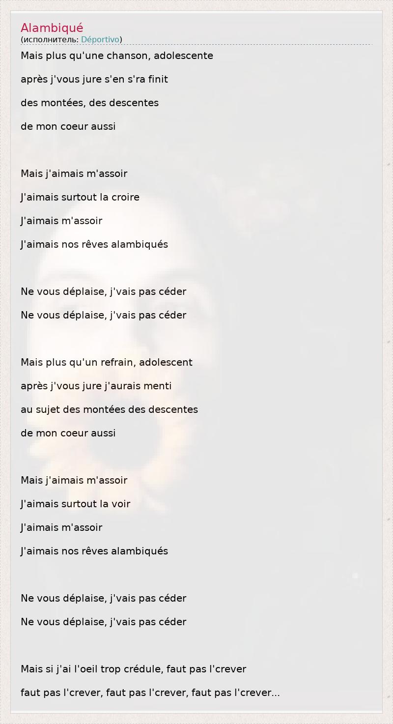 Mais plus qu'une chanson, adolescente après j'vous jure s'en s'ra finit des montées, des descentes de mon coeur aussi Mais j'aimais m'assoir J'aimais surtout la croire J'aimais m'assoir J'aimais nos rêves alambiqués Ne vous déplaise, j'vais pas céder Ne vous déplaise, j'vais pas céder Mais plus qu'un refrain, adolescent après j'vous jure j'aurais menti au sujet des montées des descentes de mon coeur aussi Mais j'aimais m'assoir J'aimais surtout la voir J'aimais m'assoir J'aimais nos rêves alambiqués Ne vous déplaise, j'vais pas céder Ne vous déplaise, j'vais pas céder Mais si j'ai l'oeil trop crédule, faut pas l'crever faut pas l'crever, faut pas l'crever, faut pas l'crever...