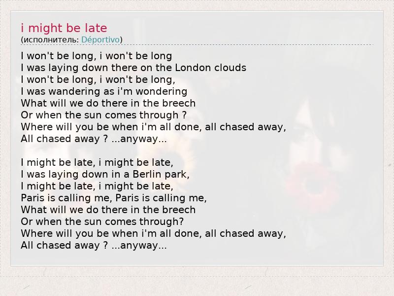 I won't be long, i won't be long I was laying down there on the London clouds I won't be long, i won't be long, I was wandering as i'm wondering What will we do there in the breech Or when the sun comes through ? Where will you be when i'm all done, all chased away, All chased away ? ...anyway... I might be late, i might be late, I was laying down in a Berlin park, I might be late, i might be late, Paris is calling me, Paris is calling me, What will we do there in the breech Or when the sun comes through? Where will you be when i'm all done, all chased away, All chased away ? ...anyway...