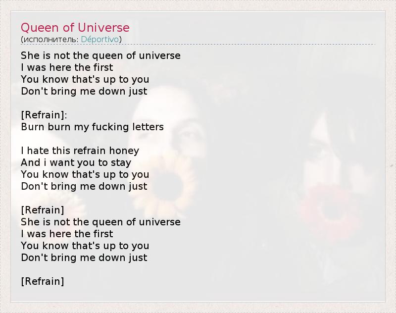 She is not the queen of universe I was here the first You know that's up to you Don't bring me down just [Refrain]: Burn burn my fucking letters I hate this refrain honey And i want you to stay You know that's up to you Don't bring me down just [Refrain] She is not the queen of universe I was here the first You know that's up to you Don't bring me down just [Refrain]