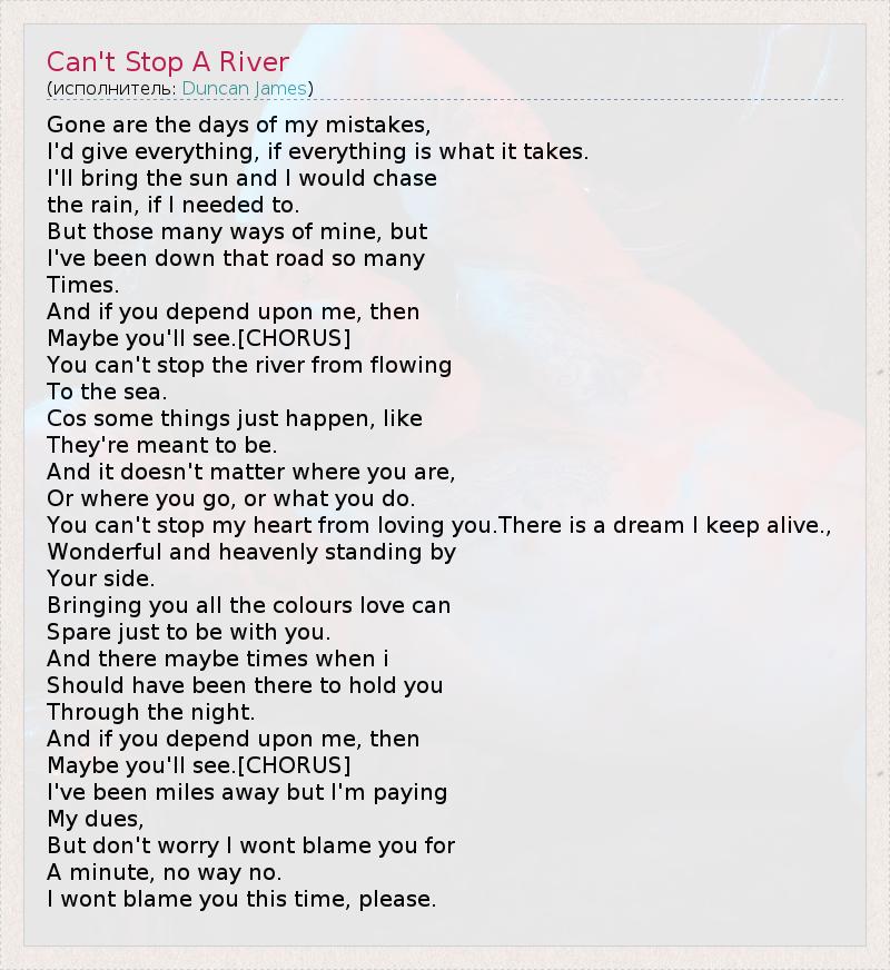 Gone are the days of my mistakes, I'd give everything, if everything is what it takes. I'll bring the sun and I would chase the rain, if I needed to. But those many ways of mine, but I've been down that road so many Times. And if you depend upon me, then Maybe you'll see.[CHORUS] You can't stop the river from flowing To the sea. Cos some things just happen, like They're meant to be. And it doesn't matter where you are, Or where you go, or what you do. You can't stop my heart from loving you.There is a dream I keep alive., Wonderful and heavenly standing by Your side. Bringing you all the colours love can Spare just to be with you. And there maybe times when i Should have been there to hold you Through the night. And if you depend upon me, then Maybe you'll see.[CHORUS] I've been miles away but I'm paying My dues, But don't worry I wont blame you for A minute, no way no. I wont blame you this time, please.
