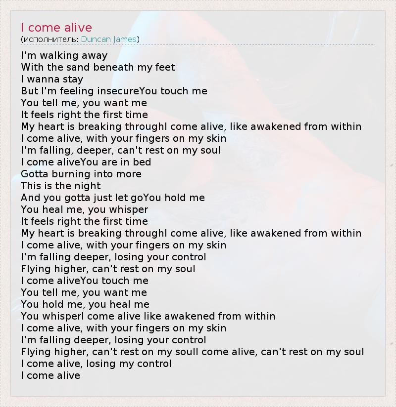 I'm walking away With the sand beneath my feet I wanna stay But I'm feeling insecureYou touch me You tell me, you want me It feels right the first time My heart is breaking throughI come alive, like awakened from within I come alive, with your fingers on my skin I'm falling, deeper, can't rest on my soul I come aliveYou are in bed Gotta burning into more This is the night And you gotta just let goYou hold me You heal me, you whisper It feels right the first time My heart is breaking throughI come alive, like awakened from within I come alive, with your fingers on my skin I'm falling deeper, losing your control Flying higher, can't rest on my soul I come aliveYou touch me You tell me, you want me You hold me, you heal me You whisperI come alive like awakened from within I come alive, with your fingers on my skin I'm falling deeper, losing your control Flying higher, can't rest on my soulI come alive, can't rest on my soul I come alive, losing my control I come alive