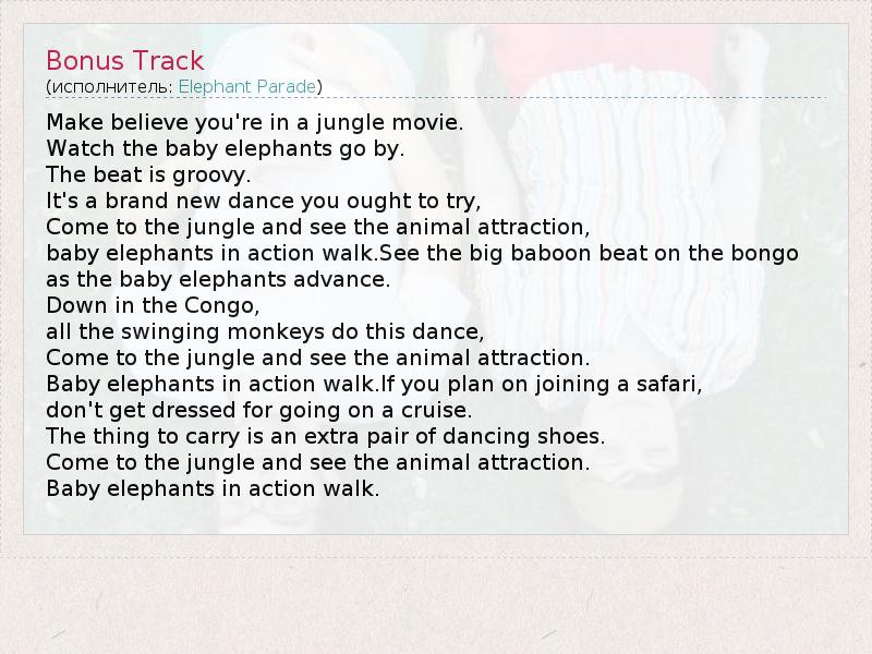 Make believe you're in a jungle movie. Watch the baby elephants go by. The beat is groovy. It's a brand new dance you ought to try, Come to the jungle and see the animal attraction, baby elephants in action walk.See the big baboon beat on the bongo as the baby elephants advance. Down in the Congo, all the swinging monkeys do this dance, Come to the jungle and see the animal attraction. Baby elephants in action walk.If you plan on joining a safari, don't get dressed for going on a cruise. The thing to carry is an extra pair of dancing shoes. Come to the jungle and see the animal attraction. Baby elephants in action walk.