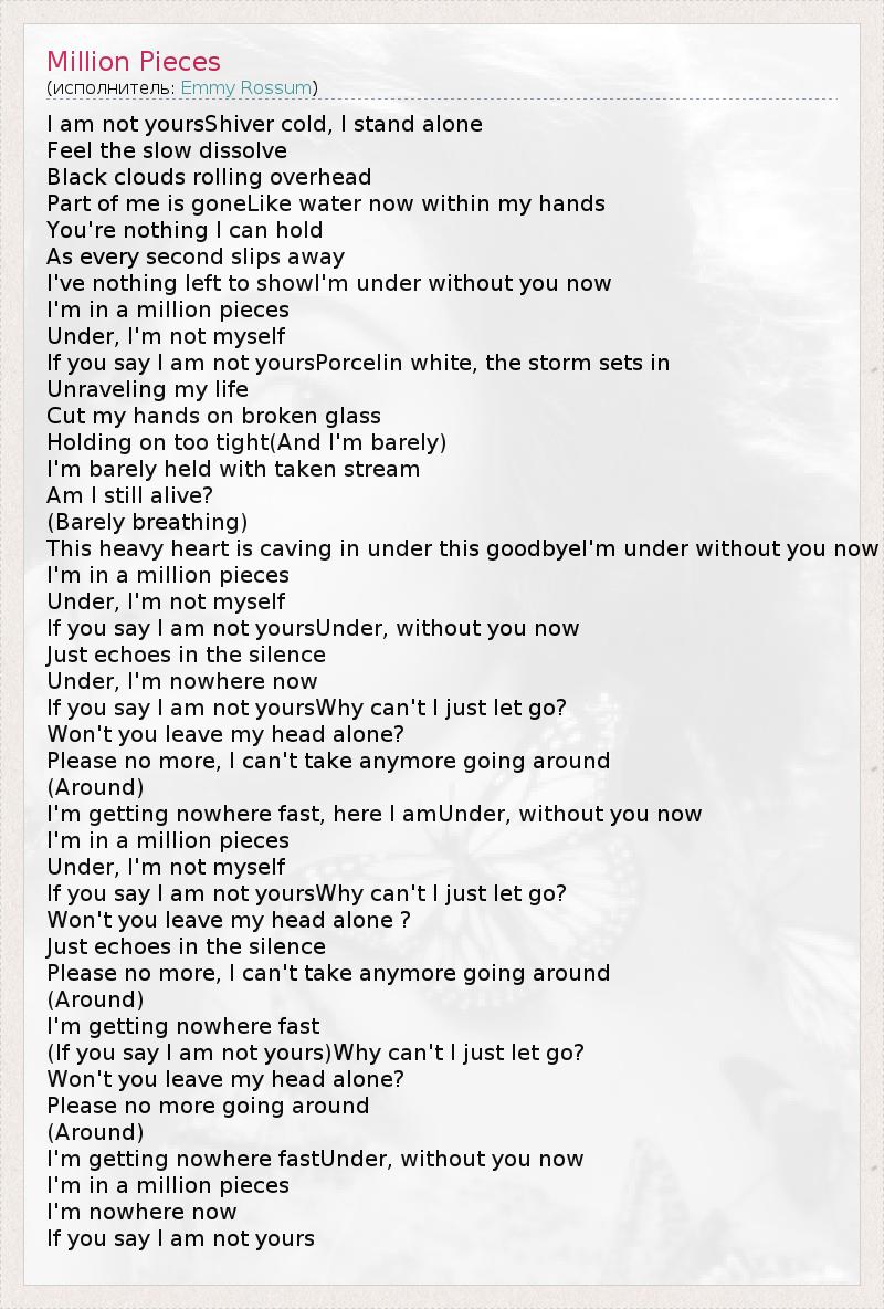 I am not yoursShiver cold, I stand alone Feel the slow dissolve Black clouds rolling overhead Part of me is goneLike water now within my hands You're nothing I can hold As every second slips away I've nothing left to showI'm under without you now I'm in a million pieces Under, I'm not myself If you say I am not yoursPorcelin white, the storm sets in Unraveling my life Cut my hands on broken glass Holding on too tight(And I'm barely) I'm barely held with taken stream Am I still alive? (Barely breathing) This heavy heart is caving in under this goodbyeI'm under without you now I'm in a million pieces Under, I'm not myself If you say I am not yoursUnder, without you now Just echoes in the silence Under, I'm nowhere now If you say I am not yoursWhy can't I just let go? Won't you leave my head alone? Please no more, I can't take anymore going around (Around) I'm getting nowhere fast, here I amUnder, without you now I'm in a million pieces Under, I'm not myself If you say I am not yoursWhy can't I just let go? Won't you leave my head alone ? Just echoes in the silence Please no more, I can't take anymore going around (Around) I'm getting nowhere fast (If you say I am not yours)Why can't I just let go? Won't you leave my head alone? Please no more going around (Around) I'm getting nowhere fastUnder, without you now I'm in a million pieces I'm nowhere now If you say I am not yours
