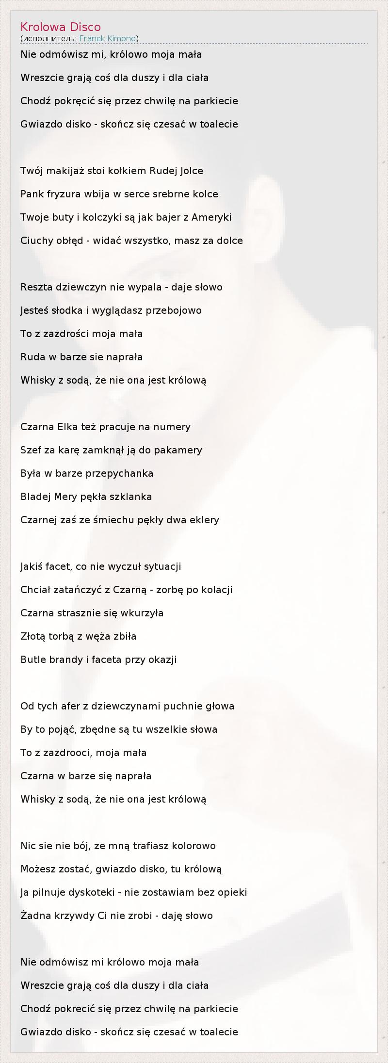 Nie odmówisz mi, królowo moja mała Wreszcie grają coś dla duszy i dla ciała Chodź pokręcić się przez chwilę na parkiecie Gwiazdo disko - skończ się czesać w toalecie Twój makijaż stoi kołkiem Rudej Jolce Pank fryzura wbija w serce srebrne kolce Twoje buty i kolczyki są jak bajer z Ameryki Ciuchy obłęd - widać wszystko, masz za dolce Reszta dziewczyn nie wypala - daje słowo Jesteś słodka i wyglądasz przebojowo To z zazdrości moja mała Ruda w barze sie naprała Whisky z sodą, że nie ona jest królową Czarna Elka też pracuje na numery Szef za karę zamknął ją do pakamery Była w barze przepychanka Bladej Mery pękła szklanka Czarnej zaś ze śmiechu pękły dwa eklery Jakiś facet, co nie wyczuł sytuacji Chciał zatańczyć z Czarną - zorbę po kolacji Czarna strasznie się wkurzyła Złotą torbą z węża zbiła Butle brandy i faceta przy okazji Od tych afer z dziewczynami puchnie głowa By to pojąć, zbędne są tu wszelkie słowa To z zazdrooci, moja mała Czarna w barze się naprała Whisky z sodą, że nie ona jest królową Nic sie nie bój, ze mną trafiasz kolorowo Możesz zostać, gwiazdo disko, tu królową Ja pilnuje dyskoteki - nie zostawiam bez opieki Żadna krzywdy Ci nie zrobi - daję słowo Nie odmówisz mi królowo moja mała Wreszcie grają coś dla duszy i dla ciała Chodź pokrecić się przez chwilę na parkiecie Gwiazdo disko - skończ się czesać w toalecie