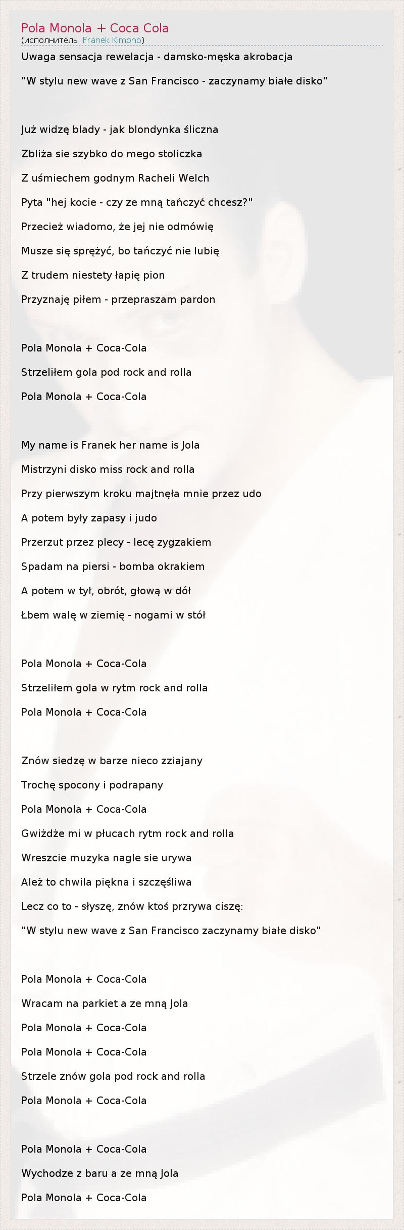 Uwaga sensacja rewelacja - damsko-męska akrobacja "W stylu new wave z San Francisco - zaczynamy białe disko" Już widzę blady - jak blondynka śliczna Zbliża sie szybko do mego stoliczka Z uśmiechem godnym Racheli Welch Pyta "hej kocie - czy ze mną tańczyć chcesz?" Przecież wiadomo, że jej nie odmówię Musze się sprężyć, bo tańczyć nie lubię Z trudem niestety łapię pion Przyznaję piłem - przepraszam pardon Pola Monola + Coca-Cola Strzeliłem gola pod rock and rolla Pola Monola + Coca-Cola My name is Franek her name is Jola Mistrzyni disko miss rock and rolla Przy pierwszym kroku majtnęła mnie przez udo A potem były zapasy i judo Przerzut przez plecy - lecę zygzakiem Spadam na piersi - bomba okrakiem A potem w tył, obrót, głową w dół Łbem walę w ziemię - nogami w stół Pola Monola + Coca-Cola Strzeliłem gola w rytm rock and rolla Pola Monola + Coca-Cola Znów siedzę w barze nieco zziajany Trochę spocony i podrapany Pola Monola + Coca-Cola Gwiżdże mi w płucach rytm rock and rolla Wreszcie muzyka nagle sie urywa Ależ to chwila piękna i szczęśliwa Lecz co to - słyszę, znów ktoś przrywa ciszę: "W stylu new wave z San Francisco zaczynamy białe disko" Pola Monola + Coca-Cola Wracam na parkiet a ze mną Jola Pola Monola + Coca-Cola Pola Monola + Coca-Cola Strzele znów gola pod rock and rolla Pola Monola + Coca-Cola Pola Monola + Coca-Cola Wychodze z baru a ze mną Jola Pola Monola + Coca-Cola