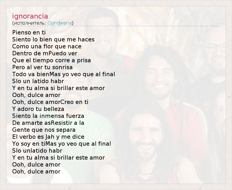 Pienso en ti Siento lo bien que me haces Como una flor que nace Dentro de mPuedo ver Que el tiempo corre a prisa Pero al ver tu sonrisa Todo va bienMas yo veo que al final Slo un latido habr Y en tu alma si brillar este amor Ooh, dulce amor Ooh, dulce amorCreo en ti Y adoro tu belleza Siento la inmensa fuerza De amarte asResistir a la Gente que nos separa El verbo es Jah y me dice Yo soy en tiMas yo veo que al final Slo unlatido habr Y en tu alma si brillar este amor Ooh, dulce amor Ooh, dulce amor