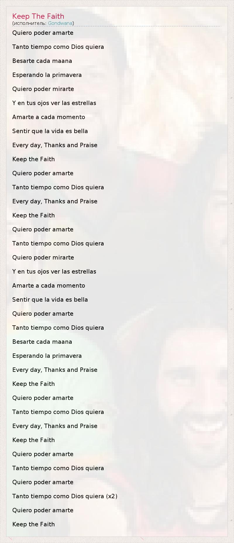 Quiero poder amarte Tanto tiempo como Dios quiera Besarte cada maana Esperando la primavera Quiero poder mirarte Y en tus ojos ver las estrellas Amarte a cada momento Sentir que la vida es bella Every day, Thanks and Praise Keep the Faith Quiero poder amarte Tanto tiempo como Dios quiera Every day, Thanks and Praise Keep the Faith Quiero poder amarte Tanto tiempo como Dios quiera Quiero poder mirarte Y en tus ojos ver las estrellas Amarte a cada momento Sentir que la vida es bella Quiero poder amarte Tanto tiempo como Dios quiera Besarte cada maana Esperando la primavera Every day, Thanks and Praise Keep the Faith Quiero poder amarte Tanto tiempo como Dios quiera Every day, Thanks and Praise Keep the Faith Quiero poder amarte Tanto tiempo como Dios quiera Quiero poder amarte Tanto tiempo como Dios quiera (x2) Quiero poder amarte Keep the Faith