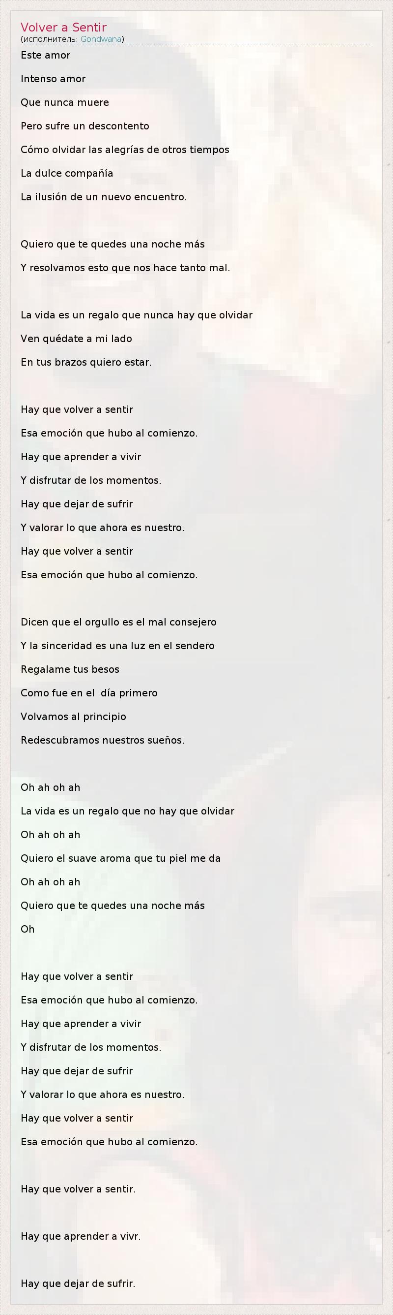 Este amor Intenso amor Que nunca muere Pero sufre un descontento Cómo olvidar las alegrías de otros tiempos La dulce compañía La ilusión de un nuevo encuentro. Quiero que te quedes una noche más Y resolvamos esto que nos hace tanto mal. La vida es un regalo que nunca hay que olvidar Ven quédate a mi lado En tus brazos quiero estar. Hay que volver a sentir Esa emoción que hubo al comienzo. Hay que aprender a vivir Y disfrutar de los momentos. Hay que dejar de sufrir Y valorar lo que ahora es nuestro. Hay que volver a sentir Esa emoción que hubo al comienzo. Dicen que el orgullo es el mal consejero Y la sinceridad es una luz en el sendero Regalame tus besos Como fue en el día primero Volvamos al principio Redescubramos nuestros sueños. Oh ah oh ah La vida es un regalo que no hay que olvidar Oh ah oh ah Quiero el suave aroma que tu piel me da Oh ah oh ah Quiero que te quedes una noche más Oh Hay que volver a sentir Esa emoción que hubo al comienzo. Hay que aprender a vivir Y disfrutar de los momentos. Hay que dejar de sufrir Y valorar lo que ahora es nuestro. Hay que volver a sentir Esa emoción que hubo al comienzo. Hay que volver a sentir. Hay que aprender a vivr. Hay que dejar de sufrir.