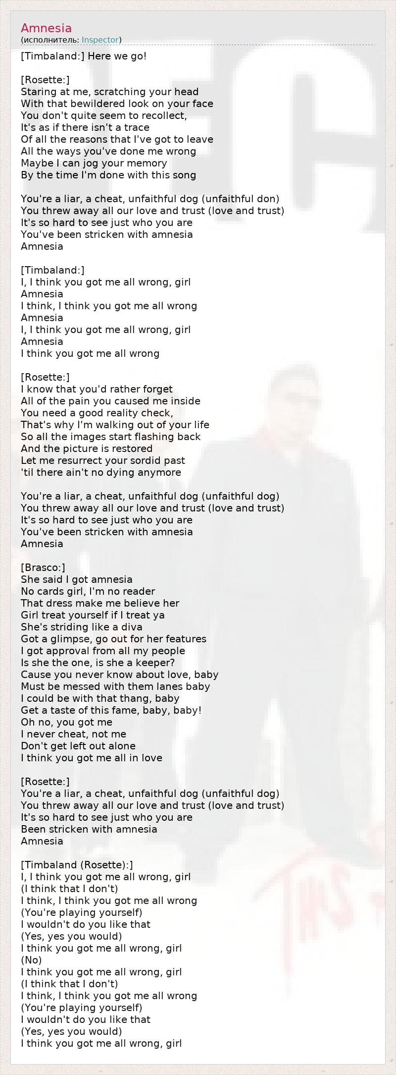 [Timbaland:] Here we go! [Rosette:] Staring at me, scratching your head With that bewildered look on your face You don't quite seem to recollect, It's as if there isn't a trace Of all the reasons that I've got to leave All the ways you've done me wrong Maybe I can jog your memory By the time I'm done with this song You're a liar, a cheat, unfaithful dog (unfaithful don) You threw away all our love and trust (love and trust) It's so hard to see just who you are You've been stricken with amnesia Amnesia [Timbaland:] I, I think you got me all wrong, girl Amnesia I think, I think you got me all wrong Amnesia I, I think you got me all wrong, girl Amnesia I think you got me all wrong [Rosette:] I know that you'd rather forget All of the pain you caused me inside You need a good reality check, That's why I'm walking out of your life So all the images start flashing back And the picture is restored Let me resurrect your sordid past 'til there ain't no dying anymore You're a liar, a cheat, unfaithful dog (unfaithful dog) You threw away all our love and trust (love and trust) It's so hard to see just who you are You've been stricken with amnesia Amnesia [Brasco:] She said I got amnesia No cards girl, I'm no reader That dress make me believe her Girl treat yourself if I treat ya She's striding like a diva Got a glimpse, go out for her features I got approval from all my people Is she the one, is she a keeper? Cause you never know about love, baby Must be messed with them lanes baby I could be with that thang, baby Get a taste of this fame, baby, baby! Oh no, you got me I never cheat, not me Don't get left out alone I think you got me all in love [Rosette:] You're a liar, a cheat, unfaithful dog (unfaithful dog) You threw away all our love and trust (love and trust) It's so hard to see just who you are Been stricken with amnesia Amnesia [Timbaland (Rosette):] I, I think you got me all wrong, girl (I think that I don't) I think, I think you got me all wrong (You're playing yourself) I wouldn't do you like that (Yes, yes you would) I think you got me all wrong, girl (No) I think you got me all wrong, girl (I think that I don't) I think, I think you got me all wrong (You're playing yourself) I wouldn't do you like that (Yes, yes you would) I think you got me all wrong, girl