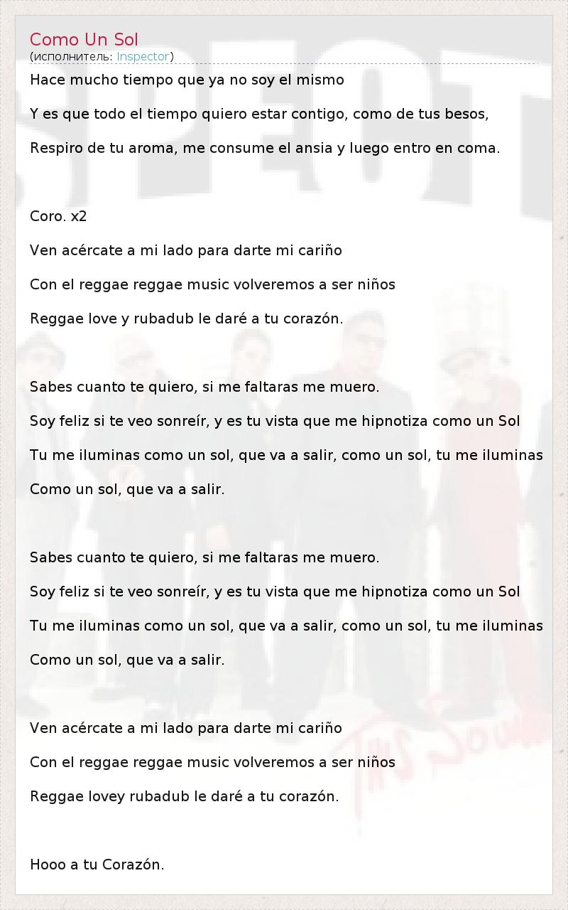 Hace mucho tiempo que ya no soy el mismo Y es que todo el tiempo quiero estar contigo, como de tus besos, Respiro de tu aroma, me consume el ansia y luego entro en coma. Coro. x2 Ven acércate a mi lado para darte mi cariño Con el reggae reggae music volveremos a ser niños Reggae love y rubadub le daré a tu corazón. Sabes cuanto te quiero, si me faltaras me muero. Soy feliz si te veo sonreír, y es tu vista que me hipnotiza como un Sol Tu me iluminas como un sol, que va a salir, como un sol, tu me iluminas Como un sol, que va a salir. Sabes cuanto te quiero, si me faltaras me muero. Soy feliz si te veo sonreír, y es tu vista que me hipnotiza como un Sol Tu me iluminas como un sol, que va a salir, como un sol, tu me iluminas Como un sol, que va a salir. Ven acércate a mi lado para darte mi cariño Con el reggae reggae music volveremos a ser niños Reggae lovey rubadub le daré a tu corazón. Hooo a tu Corazón.