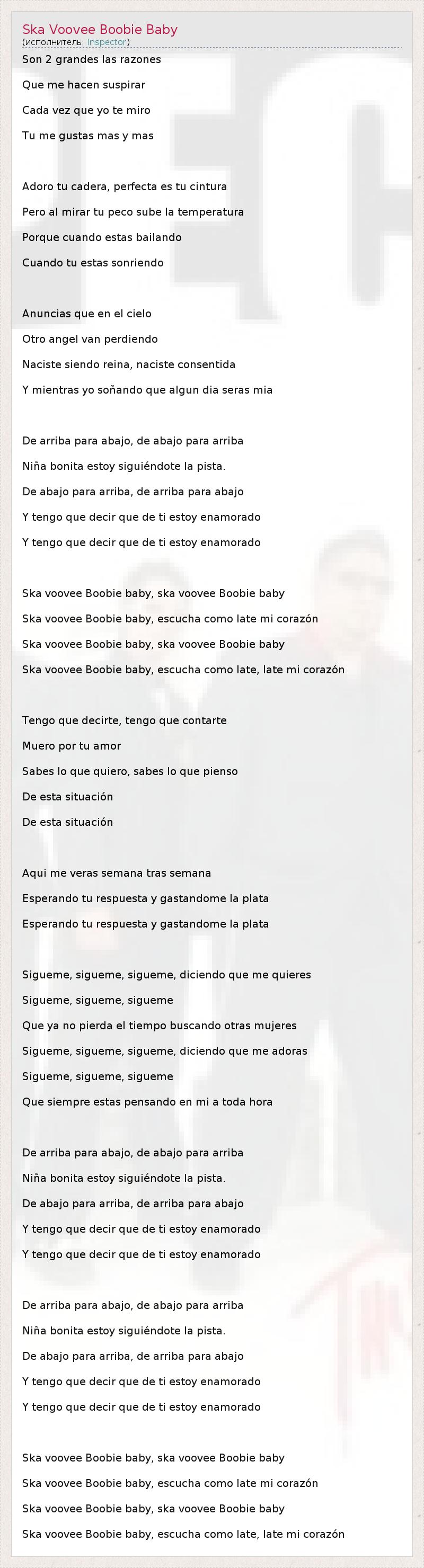 Son 2 grandes las razones Que me hacen suspirar Cada vez que yo te miro Tu me gustas mas y mas Adoro tu cadera, perfecta es tu cintura Pero al mirar tu peco sube la temperatura Porque cuando estas bailando Cuando tu estas sonriendo Anuncias que en el cielo Otro angel van perdiendo Naciste siendo reina, naciste consentida Y mientras yo soñando que algun dia seras mia De arriba para abajo, de abajo para arriba Niña bonita estoy siguiéndote la pista. De abajo para arriba, de arriba para abajo Y tengo que decir que de ti estoy enamorado Y tengo que decir que de ti estoy enamorado Ska voovee Boobie baby, ska voovee Boobie baby Ska voovee Boobie baby, escucha como late mi corazón Ska voovee Boobie baby, ska voovee Boobie baby Ska voovee Boobie baby, escucha como late, late mi corazón Tengo que decirte, tengo que contarte Muero por tu amor Sabes lo que quiero, sabes lo que pienso De esta situación De esta situación Aqui me veras semana tras semana Esperando tu respuesta y gastandome la plata Esperando tu respuesta y gastandome la plata Sigueme, sigueme, sigueme, diciendo que me quieres Sigueme, sigueme, sigueme Que ya no pierda el tiempo buscando otras mujeres Sigueme, sigueme, sigueme, diciendo que me adoras Sigueme, sigueme, sigueme Que siempre estas pensando en mi a toda hora De arriba para abajo, de abajo para arriba Niña bonita estoy siguiéndote la pista. De abajo para arriba, de arriba para abajo Y tengo que decir que de ti estoy enamorado Y tengo que decir que de ti estoy enamorado De arriba para abajo, de abajo para arriba Niña bonita estoy siguiéndote la pista. De abajo para arriba, de arriba para abajo Y tengo que decir que de ti estoy enamorado Y tengo que decir que de ti estoy enamorado Ska voovee Boobie baby, ska voovee Boobie baby Ska voovee Boobie baby, escucha como late mi corazón Ska voovee Boobie baby, ska voovee Boobie baby Ska voovee Boobie baby, escucha como late, late mi corazón