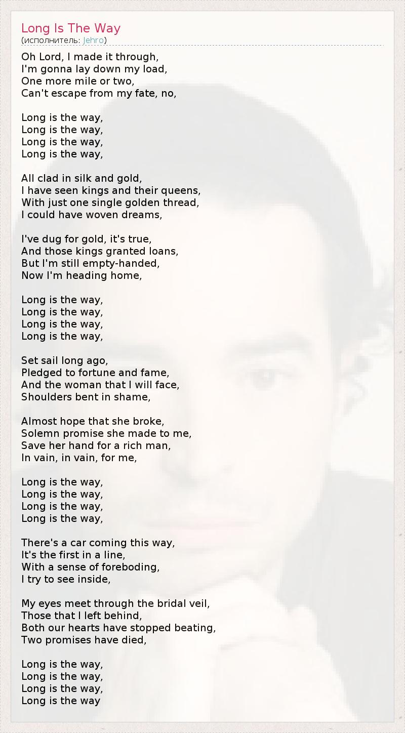 Oh Lord, I made it through, I'm gonna lay down my load, One more mile or two, Can't escape from my fate, no, Long is the way, Long is the way, Long is the way, Long is the way, All clad in silk and gold, I have seen kings and their queens, With just one single golden thread, I could have woven dreams, I've dug for gold, it's true, And those kings granted loans, But I'm still empty-handed, Now I'm heading home, Long is the way, Long is the way, Long is the way, Long is the way, Set sail long ago, Pledged to fortune and fame, And the woman that I will face, Shoulders bent in shame, Almost hope that she broke, Solemn promise she made to me, Save her hand for a rich man, In vain, in vain, for me, Long is the way, Long is the way, Long is the way, Long is the way, There's a car coming this way, It's the first in a line, With a sense of foreboding, I try to see inside, My eyes meet through the bridal veil, Those that I left behind, Both our hearts have stopped beating, Two promises have died, Long is the way, Long is the way, Long is the way, Long is the way