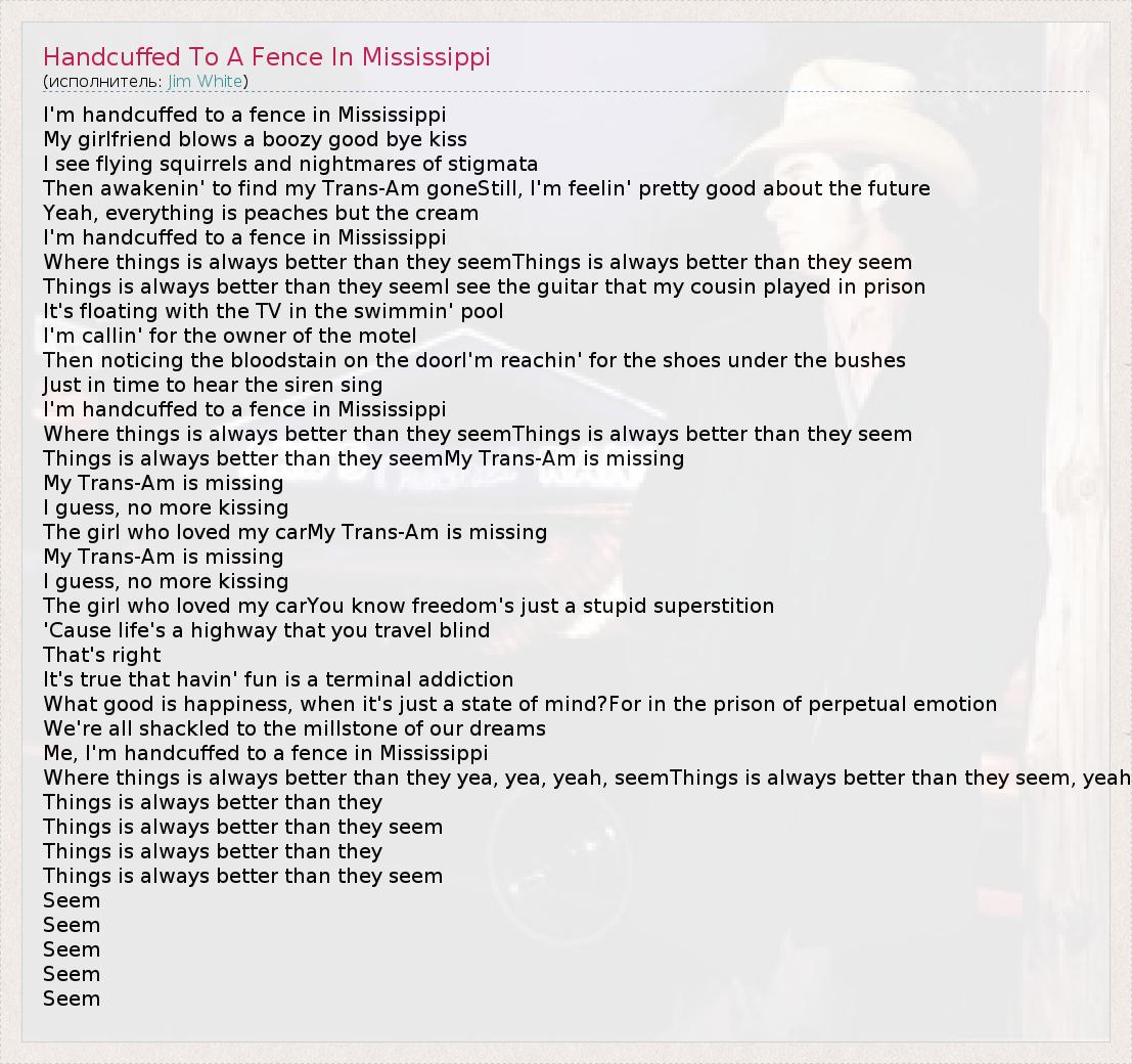 А как ты думаешь, о чем песня "Handcuffed To A Fence In Mississippi" ?