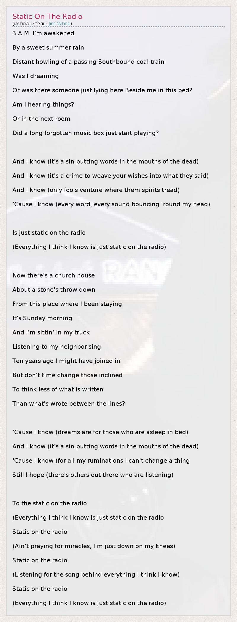 3 A.M. I'm awakened By a sweet summer rain Distant howling of a passing Southbound coal train Was I dreaming Or was there someone just lying here Beside me in this bed? Am I hearing things? Or in the next room Did a long forgotten music box just start playing? And I know (it's a sin putting words in the mouths of the dead) And I know (it's a crime to weave your wishes into what they said) And I know (only fools venture where them spirits tread) 'Cause I know (every word, every sound bouncing 'round my head) Is just static on the radio (Everything I think I know is just static on the radio) Now there's a church house About a stone's throw down From this place where I been staying It's Sunday morning And I'm sittin' in my truck Listening to my neighbor sing Ten years ago I might have joined in But don't time change those inclined To think less of what is written Than what's wrote between the lines? 'Cause I know (dreams are for those who are asleep in bed) And I know (it's a sin putting words in the mouths of the dead) 'Cause I know (for all my ruminations I can't change a thing Still I hope (there's others out there who are listening) To the static on the radio (Everything I think I know is just static on the radio Static on the radio (Ain't praying for miracles, I'm just down on my knees) Static on the radio (Listening for the song behind everything I think I know) Static on the radio (Everything I think I know is just static on the radio)