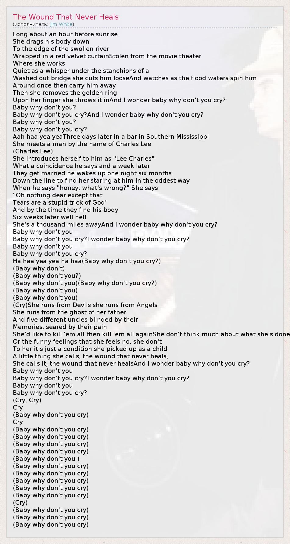 Long about an hour before sunrise She drags his body down To the edge of the swollen river Wrapped in a red velvet curtainStolen from the movie theater Where she works Quiet as a whisper under the stanchions of a Washed out bridge she cuts him looseAnd watches as the flood waters spin him Around once then carry him away Then she removes the golden ring Upon her finger she throws it inAnd I wonder baby why don't you cry? Baby why don't you? Baby why don't you cry?And I wonder baby why don't you cry? Baby why don't you? Baby why don't you cry? Aah haa yea yeaThree days later in a bar in Southern Mississippi She meets a man by the name of Charles Lee (Charles Lee) She introduces herself to him as "Lee Charles" What a coincidence he says and a week later They get married he wakes up one night six months Down the line to find her staring at him in the oddest way When he says "honey, what's wrong?" She says "Oh nothing dear except that Tears are a stupid trick of God" And by the time they find his body Six weeks later well hell She's a thousand miles awayAnd I wonder baby why don't you cry? Baby why don't you Baby why don't you cry?I wonder baby why don't you cry? Baby why don't you Baby why don't you cry? Ha haa yea yea ha haa(Baby why don't you cry?) (Baby why don't) (Baby why don't you?) (Baby why don't you)(Baby why don't you cry?) (Baby why don't you) (Baby why don't you) (Cry)She runs from Devils she runs from Angels She runs from the ghost of her father And five different uncles blinded by their Memories, seared by their pain She'd like to kill 'em all then kill 'em all againShe don't think much about what she's done Or the funny feelings that she feels no, she don't To her it's just a condition she picked up as a child A little thing she calls, the wound that never heals, She calls it, the wound that never healsAnd I wonder baby why don't you cry? Baby why don't you Baby why don't you cry?I wonder baby why don't you cry? Baby why don't you Baby why don't you cry? (Cry, Cry) Cry (Baby why don't you cry) Cry (Baby why don't you cry) (Baby why don't you cry) (Baby why don't you cry) (Baby why don't you cry) (Baby why don't you ) (Baby why don't you cry) (Baby why don't you cry) (Baby why don't you cry) (Baby why don't you cry) (Baby why don't you cry) (Cry) (Baby why don't you cry) (Baby why don't you cry) (Baby why don't you cry)