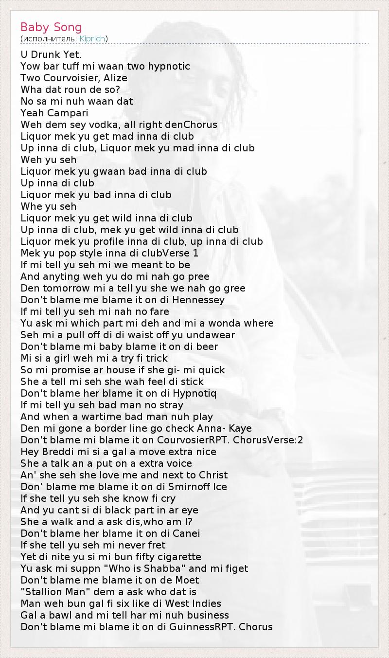 U Drunk Yet. Yow bar tuff mi waan two hypnotic Two Courvoisier, Alize Wha dat roun de so? No sa mi nuh waan dat Yeah Campari Weh dem sey vodka, all right denChorus Liquor mek yu get mad inna di club Up inna di club, Liquor mek yu mad inna di club Weh yu seh Liquor mek yu gwaan bad inna di club Up inna di club Liquor mek yu bad inna di club Whe yu seh Liquor mek yu get wild inna di club Up inna di club, mek yu get wild inna di club Liquor mek yu profile inna di club, up inna di club Mek yu pop style inna di clubVerse 1 If mi tell yu seh mi we meant to be And anyting weh yu do mi nah go pree Den tomorrow mi a tell yu she we nah go gree Don't blame me blame it on di Hennessey If mi tell yu seh mi nah no fare Yu ask mi which part mi deh and mi a wonda where Seh mi a pull off di di waist off yu undawear Don't blame mi baby blame it on di beer Mi si a girl weh mi a try fi trick So mi promise ar house if she gi- mi quick She a tell mi seh she wah feel di stick Don't blame her blame it on di Hypnotiq If mi tell yu seh bad man no stray And when a wartime bad man nuh play Den mi gone a border line go check Anna- Kaye Don't blame mi blame it on CourvosierRPT. ChorusVerse:2 Hey Breddi mi si a gal a move extra nice She a talk an a put on a extra voice An' she seh she love me and next to Christ Don' blame me blame it on di Smirnoff Ice If she tell yu seh she know fi cry And yu cant si di black part in ar eye She a walk and a ask dis,who am I? Don't blame her blame it on di Canei If she tell yu seh mi never fret Yet di nite yu si mi bun fifty cigarette Yu ask mi suppn "Who is Shabba" and mi figet Don't blame me blame it on de Moet "Stallion Man" dem a ask who dat is Man weh bun gal fi six like di West Indies Gal a bawl and mi tell har mi nuh business Don't blame mi blame it on di GuinnessRPT. Chorus