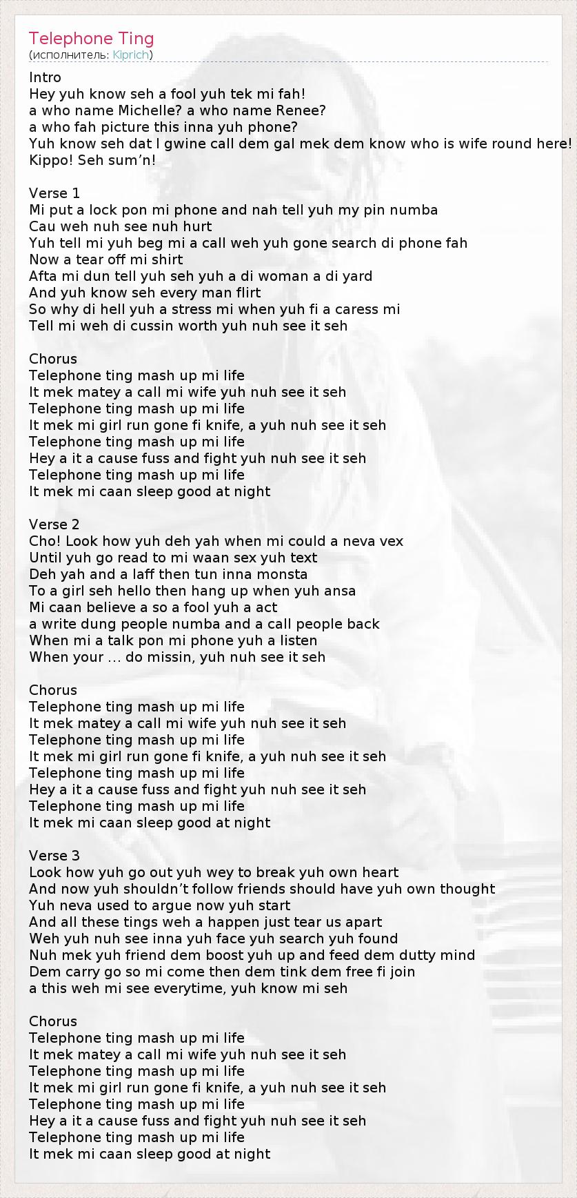 Intro Hey yuh know seh a fool yuh tek mi fah! a who name Michelle? a who name Renee? a who fah picture this inna yuh phone? Yuh know seh dat I gwine call dem gal mek dem know who is wife round here! Kippo! Seh sum’n! Verse 1 Mi put a lock pon mi phone and nah tell yuh my pin numba Cau weh nuh see nuh hurt Yuh tell mi yuh beg mi a call weh yuh gone search di phone fah Now a tear off mi shirt Afta mi dun tell yuh seh yuh a di woman a di yard And yuh know seh every man flirt So why di hell yuh a stress mi when yuh fi a caress mi Tell mi weh di cussin worth yuh nuh see it seh Chorus Telephone ting mash up mi life It mek matey a call mi wife yuh nuh see it seh Telephone ting mash up mi life It mek mi girl run gone fi knife, a yuh nuh see it seh Telephone ting mash up mi life Hey a it a cause fuss and fight yuh nuh see it seh Telephone ting mash up mi life It mek mi caan sleep good at night Verse 2 Cho! Look how yuh deh yah when mi could a neva vex Until yuh go read to mi waan sex yuh text Deh yah and a laff then tun inna monsta To a girl seh hello then hang up when yuh ansa Mi caan believe a so a fool yuh a act a write dung people numba and a call people back When mi a talk pon mi phone yuh a listen When your … do missin, yuh nuh see it seh Chorus Telephone ting mash up mi life It mek matey a call mi wife yuh nuh see it seh Telephone ting mash up mi life It mek mi girl run gone fi knife, a yuh nuh see it seh Telephone ting mash up mi life Hey a it a cause fuss and fight yuh nuh see it seh Telephone ting mash up mi life It mek mi caan sleep good at night Verse 3 Look how yuh go out yuh wey to break yuh own heart And now yuh shouldn’t follow friends should have yuh own thought Yuh neva used to argue now yuh start And all these tings weh a happen just tear us apart Weh yuh nuh see inna yuh face yuh search yuh found Nuh mek yuh friend dem boost yuh up and feed dem dutty mind Dem carry go so mi come then dem tink dem free fi join a this weh mi see everytime, yuh know mi seh Chorus Telephone ting mash up mi life It mek matey a call mi wife yuh nuh see it seh Telephone ting mash up mi life It mek mi girl run gone fi knife, a yuh nuh see it seh Telephone ting mash up mi life Hey a it a cause fuss and fight yuh nuh see it seh Telephone ting mash up mi life It mek mi caan sleep good at night