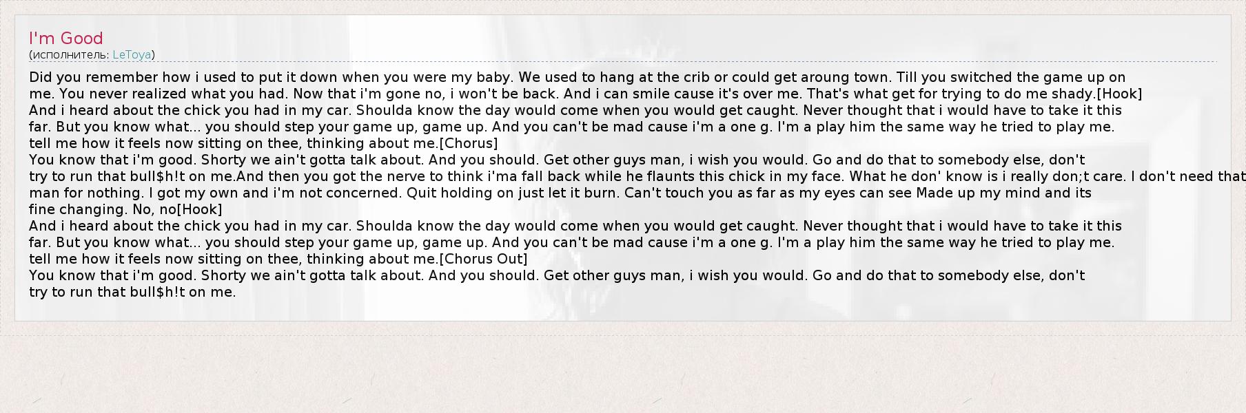 Did you remember how i used to put it down when you were my baby. We used to hang at the crib or could get aroung town. Till you switched the game up on me. You never realized what you had. Now that i'm gone no, i won't be back. And i can smile cause it's over me. That's what get for trying to do me shady.[Hook] And i heard about the chick you had in my car. Shoulda know the day would come when you would get caught. Never thought that i would have to take it this far. But you know what... you should step your game up, game up. And you can't be mad cause i'm a one g. I'm a play him the same way he tried to play me. tell me how it feels now sitting on thee, thinking about me.[Chorus] You know that i'm good. Shorty we ain't gotta talk about. And you should. Get other guys man, i wish you would. Go and do that to somebody else, don't try to run that bull$h!t on me.And then you got the nerve to think i'ma fall back while he flaunts this chick in my face. What he don' know is i really don;t care. I don't need that man for nothing. I got my own and i'm not concerned. Quit holding on just let it burn. Can't touch you as far as my eyes can see Made up my mind and its fine changing. No, no[Hook] And i heard about the chick you had in my car. Shoulda know the day would come when you would get caught. Never thought that i would have to take it this far. But you know what... you should step your game up, game up. And you can't be mad cause i'm a one g. I'm a play him the same way he tried to play me. tell me how it feels now sitting on thee, thinking about me.[Chorus Out] You know that i'm good. Shorty we ain't gotta talk about. And you should. Get other guys man, i wish you would. Go and do that to somebody else, don't try to run that bull$h!t on me.