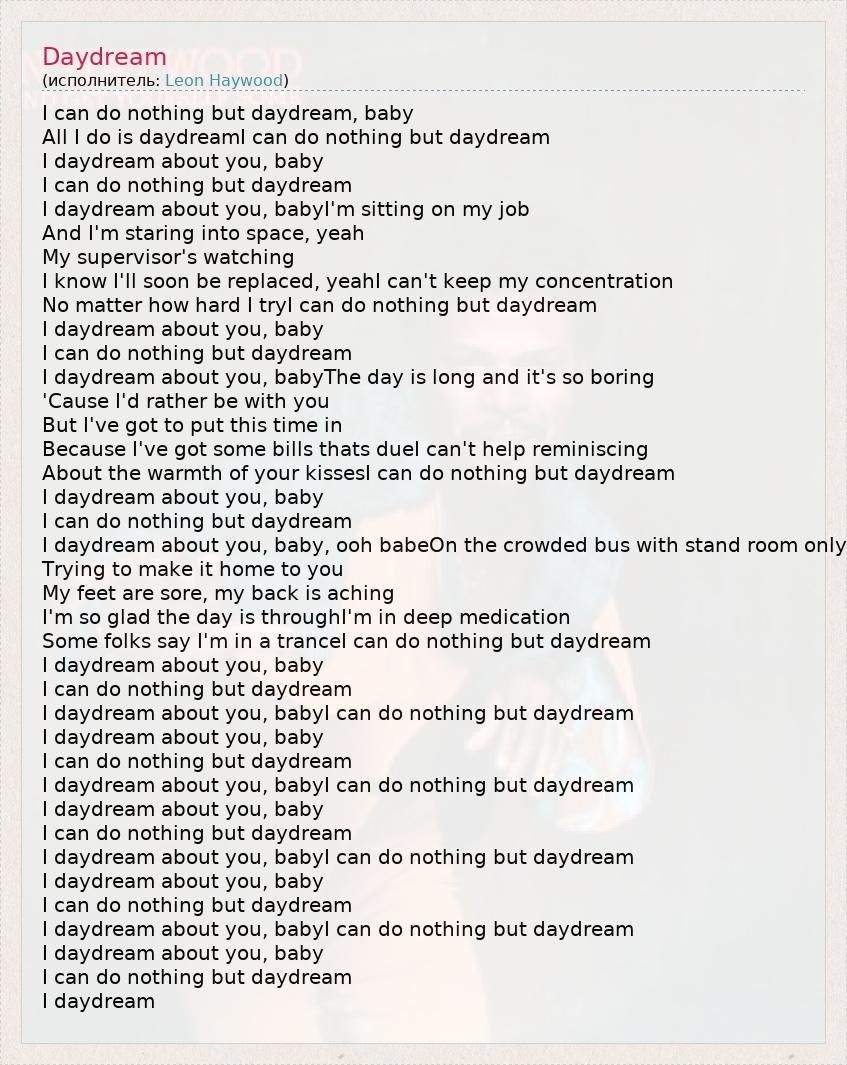 I can do nothing but daydream, baby All I do is daydreamI can do nothing but daydream I daydream about you, baby I can do nothing but daydream I daydream about you, babyI'm sitting on my job And I'm staring into space, yeah My supervisor's watching I know I'll soon be replaced, yeahI can't keep my concentration No matter how hard I tryI can do nothing but daydream I daydream about you, baby I can do nothing but daydream I daydream about you, babyThe day is long and it's so boring 'Cause I'd rather be with you But I've got to put this time in Because I've got some bills thats dueI can't help reminiscing About the warmth of your kissesI can do nothing but daydream I daydream about you, baby I can do nothing but daydream I daydream about you, baby, ooh babeOn the crowded bus with stand room only Trying to make it home to you My feet are sore, my back is aching I'm so glad the day is throughI'm in deep medication Some folks say I'm in a tranceI can do nothing but daydream I daydream about you, baby I can do nothing but daydream I daydream about you, babyI can do nothing but daydream I daydream about you, baby I can do nothing but daydream I daydream about you, babyI can do nothing but daydream I daydream about you, baby I can do nothing but daydream I daydream about you, babyI can do nothing but daydream I daydream about you, baby I can do nothing but daydream I daydream about you, babyI can do nothing but daydream I daydream about you, baby I can do nothing but daydream I daydream
