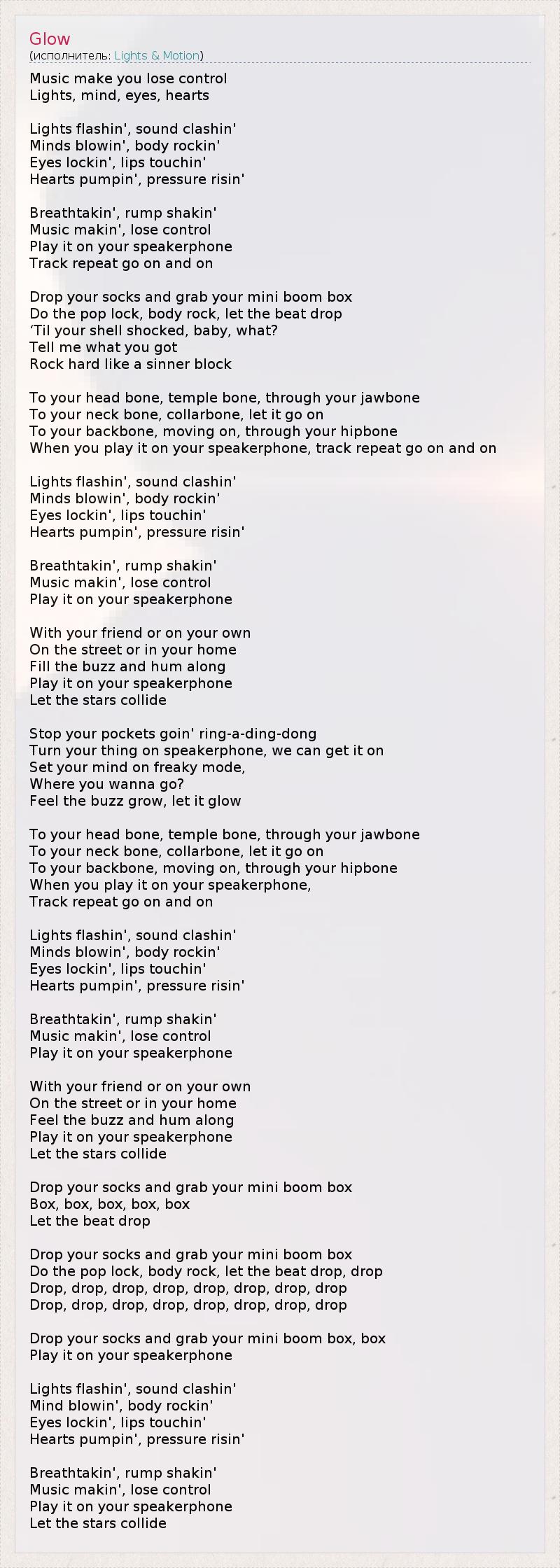 Music make you lose control Lights, mind, eyes, hearts Lights flashin', sound clashin' Minds blowin', body rockin' Eyes lockin', lips touchin' Hearts pumpin', pressure risin' Breathtakin', rump shakin' Music makin', lose control Play it on your speakerphone Track repeat go on and on Drop your socks and grab your mini boom box Do the pop lock, body rock, let the beat drop ‘Til your shell shocked, baby, what? Tell me what you got Rock hard like a sinner block To your head bone, temple bone, through your jawbone To your neck bone, collarbone, let it go on To your backbone, moving on, through your hipbone When you play it on your speakerphone, track repeat go on and on Lights flashin', sound clashin' Minds blowin', body rockin' Eyes lockin', lips touchin' Hearts pumpin', pressure risin' Breathtakin', rump shakin' Music makin', lose control Play it on your speakerphone With your friend or on your own On the street or in your home Fill the buzz and hum along Play it on your speakerphone Let the stars collide Stop your pockets goin' ring-a-ding-dong Turn your thing on speakerphone, we can get it on Set your mind on freaky mode, Where you wanna go? Feel the buzz grow, let it glow To your head bone, temple bone, through your jawbone To your neck bone, collarbone, let it go on To your backbone, moving on, through your hipbone When you play it on your speakerphone, Track repeat go on and on Lights flashin', sound clashin' Minds blowin', body rockin' Eyes lockin', lips touchin' Hearts pumpin', pressure risin' Breathtakin', rump shakin' Music makin', lose control Play it on your speakerphone With your friend or on your own On the street or in your home Feel the buzz and hum along Play it on your speakerphone Let the stars collide Drop your socks and grab your mini boom box Box, box, box, box, box Let the beat drop Drop your socks and grab your mini boom box Do the pop lock, body rock, let the beat drop, drop Drop, drop, drop, drop, drop, drop, drop, drop Drop, drop, drop, drop, drop, drop, drop, drop Drop your socks and grab your mini boom box, box Play it on your speakerphone Lights flashin', sound clashin' Mind blowin', body rockin' Eyes lockin', lips touchin' Hearts pumpin', pressure risin' Breathtakin', rump shakin' Music makin', lose control Play it on your speakerphone Let the stars collide
