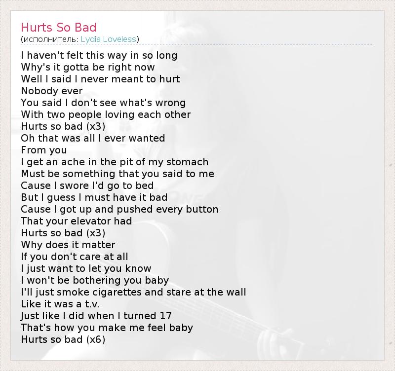 I haven't felt this way in so long Why's it gotta be right now Well I said I never meant to hurt Nobody ever You said I don't see what's wrong With two people loving each other Hurts so bad (x3) Oh that was all I ever wanted From you I get an ache in the pit of my stomach Must be something that you said to me Cause I swore I'd go to bed But I guess I must have it bad Cause I got up and pushed every button That your elevator had Hurts so bad (x3) Why does it matter If you don't care at all I just want to let you know I won't be bothering you baby I'll just smoke cigarettes and stare at the wall Like it was a t.v. Just like I did when I turned 17 That's how you make me feel baby Hurts so bad (x6)