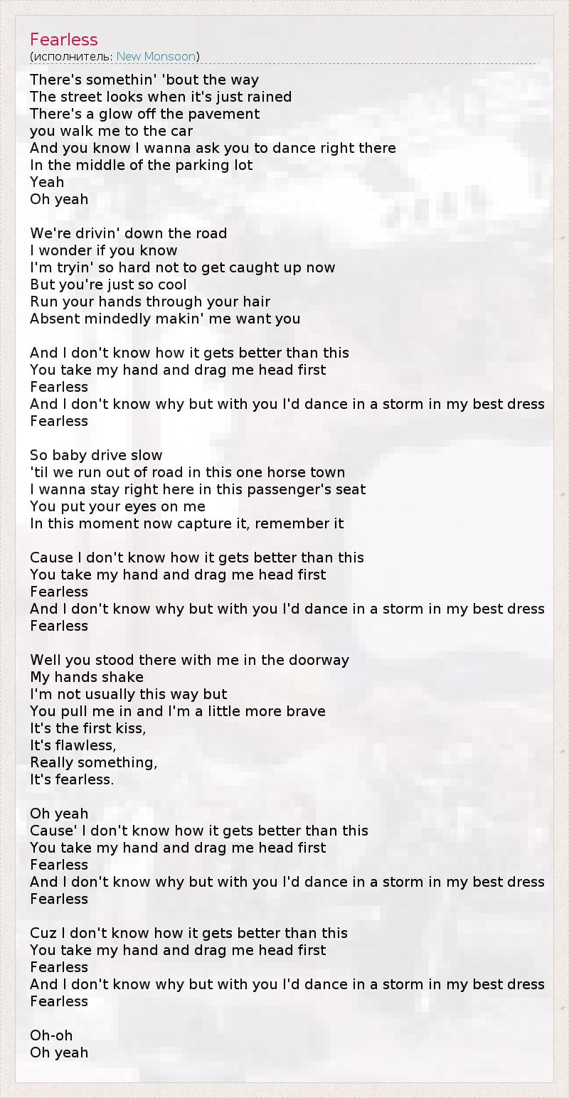 There's somethin' 'bout the way The street looks when it's just rained There's a glow off the pavement you walk me to the car And you know I wanna ask you to dance right there In the middle of the parking lot Yeah Oh yeah We're drivin' down the road I wonder if you know I'm tryin' so hard not to get caught up now But you're just so cool Run your hands through your hair Absent mindedly makin' me want you And I don't know how it gets better than this You take my hand and drag me head first Fearless And I don't know why but with you I'd dance in a storm in my best dress Fearless So baby drive slow 'til we run out of road in this one horse town I wanna stay right here in this passenger's seat You put your eyes on me In this moment now capture it, remember it Cause I don't know how it gets better than this You take my hand and drag me head first Fearless And I don't know why but with you I'd dance in a storm in my best dress Fearless Well you stood there with me in the doorway My hands shake I'm not usually this way but You pull me in and I'm a little more brave It's the first kiss, It's flawless, Really something, It's fearless. Oh yeah Cause' I don't know how it gets better than this You take my hand and drag me head first Fearless And I don't know why but with you I'd dance in a storm in my best dress Fearless Cuz I don't know how it gets better than this You take my hand and drag me head first Fearless And I don't know why but with you I'd dance in a storm in my best dress Fearless Oh-oh Oh yeah