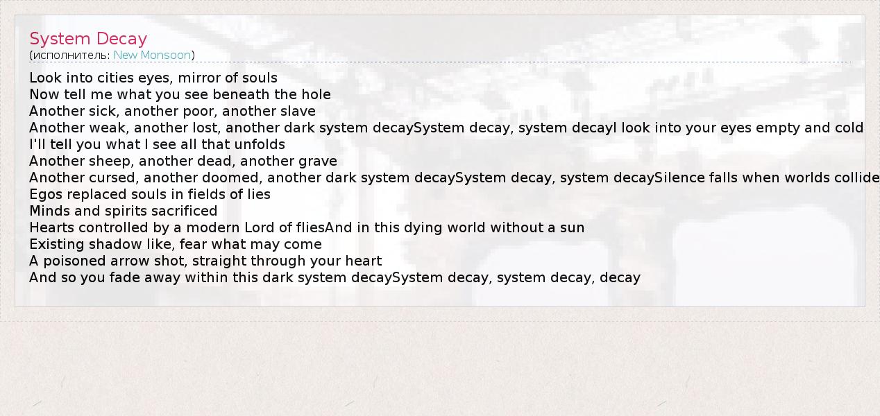 Look into cities eyes, mirror of souls Now tell me what you see beneath the hole Another sick, another poor, another slave Another weak, another lost, another dark system decaySystem decay, system decayI look into your eyes empty and cold I'll tell you what I see all that unfolds Another sheep, another dead, another grave Another cursed, another doomed, another dark system decaySystem decay, system decaySilence falls when worlds collide Egos replaced souls in fields of lies Minds and spirits sacrificed Hearts controlled by a modern Lord of fliesAnd in this dying world without a sun Existing shadow like, fear what may come A poisoned arrow shot, straight through your heart And so you fade away within this dark system decaySystem decay, system decay, decay