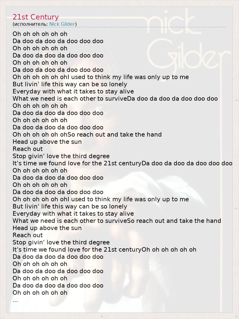 Oh oh oh oh oh oh Da doo da doo da doo doo doo Oh oh oh oh oh oh Da doo da doo da doo doo doo Oh oh oh oh oh oh Da doo da doo da doo doo doo Oh oh oh oh oh ohI used to think my life was only up to me But livin' life this way can be so lonely Everyday with what it takes to stay alive What we need is each other to surviveDa doo da doo da doo doo doo Oh oh oh oh oh oh Da doo da doo da doo doo doo Oh oh oh oh oh oh Da doo da doo da doo doo doo Oh oh oh oh oh ohSo reach out and take the hand Head up above the sun Reach out Stop givin' love the third degree It's time we found love for the 21st centuryDa doo da doo da doo doo doo Oh oh oh oh oh oh Da doo da doo da doo doo doo Oh oh oh oh oh oh Da doo da doo da doo doo doo Oh oh oh oh oh ohI used to think my life was only up to me But livin' life this way can be so lonely Everyday with what it takes to stay alive What we need is each other to surviveSo reach out and take the hand Head up above the sun Reach out Stop givin' love the third degree It's time we found love for the 21st centuryOh oh oh oh oh oh Da doo da doo da doo doo doo Oh oh oh oh oh oh Da doo da doo da doo doo doo Oh oh oh oh oh oh Da doo da doo da doo doo doo Oh oh oh oh oh oh ...