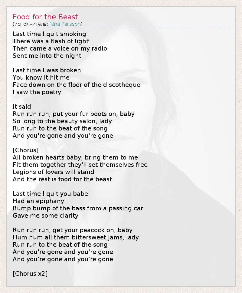 Last time I quit smoking There was a flash of light Then came a voice on my radio Sent me into the night Last time I was broken You know it hit me Face down on the floor of the discotheque I saw the poetry It said Run run run, put your fur boots on, baby So long to the beauty salon, lady Run run to the beat of the song And you're gone and you're gone [Chorus] All broken hearts baby, bring them to me Fit them together they'll set themselves free Legions of lovers will stand And the rest is food for the beast Last time I quit you babe Had an epiphany Bump bump of the bass from a passing car Gave me some clarity Run run run, get your peacock on, baby Hum hum all them bittersweet jams, lady Run run to the beat of the song And you're gone and you're gone And you're gone and you're gone [Chorus x2]