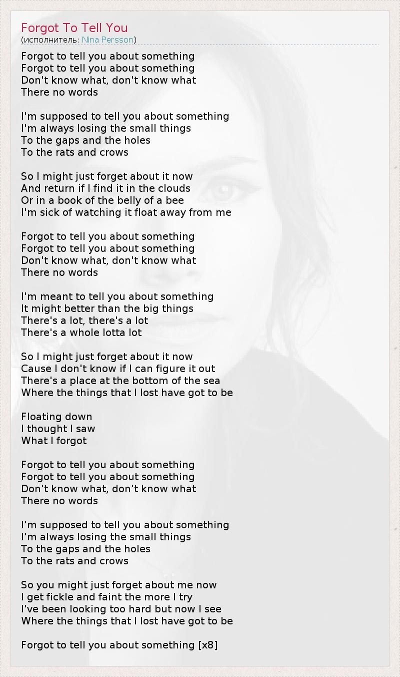 Forgot to tell you about something Forgot to tell you about something Don't know what, don't know what There no words I'm supposed to tell you about something I'm always losing the small things To the gaps and the holes To the rats and crows So I might just forget about it now And return if I find it in the clouds Or in a book of the belly of a bee I'm sick of watching it float away from me Forgot to tell you about something Forgot to tell you about something Don't know what, don't know what There no words I'm meant to tell you about something It might better than the big things There's a lot, there's a lot There's a whole lotta lot So I might just forget about it now Cause I don't know if I can figure it out There's a place at the bottom of the sea Where the things that I lost have got to be Floating down I thought I saw What I forgot Forgot to tell you about something Forgot to tell you about something Don't know what, don't know what There no words I'm supposed to tell you about something I'm always losing the small things To the gaps and the holes To the rats and crows So you might just forget about me now I get fickle and faint the more I try I've been looking too hard but now I see Where the things that I lost have got to be Forgot to tell you about something [x8]