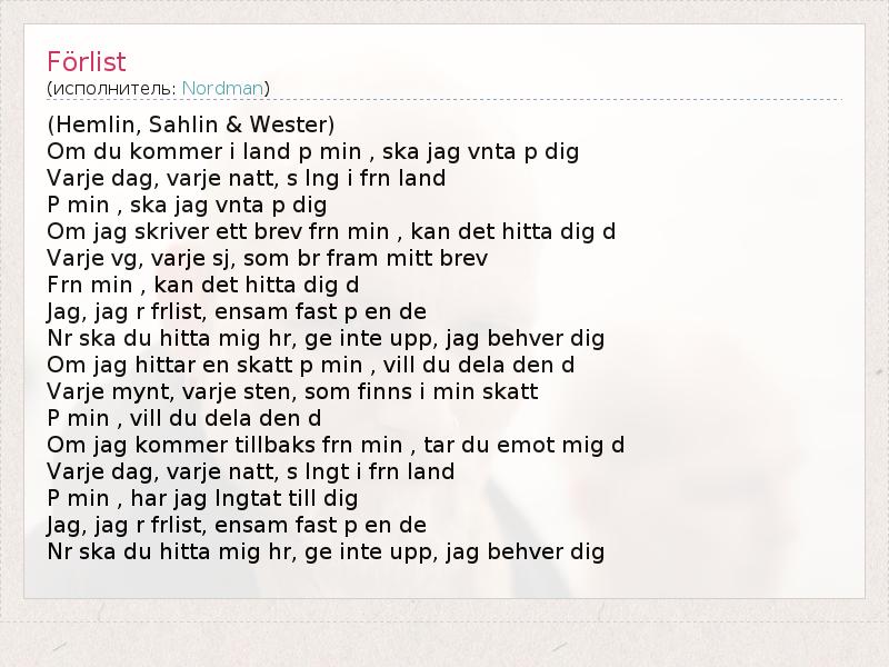 Это интересно:Nordman шведская группа, основанная в 1993 году. Стиль смешивает в себе народную, рок и поп музыку. Этот жанр называется etnorock или folkrock на шведском языке.Группу составляют Håkan Hemlin, как певец и лидер группы, и Mats Wester, который играет на никельхарпе.Хитами группы были Förlist ("Кораблекрушение") и Vandraren ("Странник"). Группа распалась в 1998 из-за... продолжение