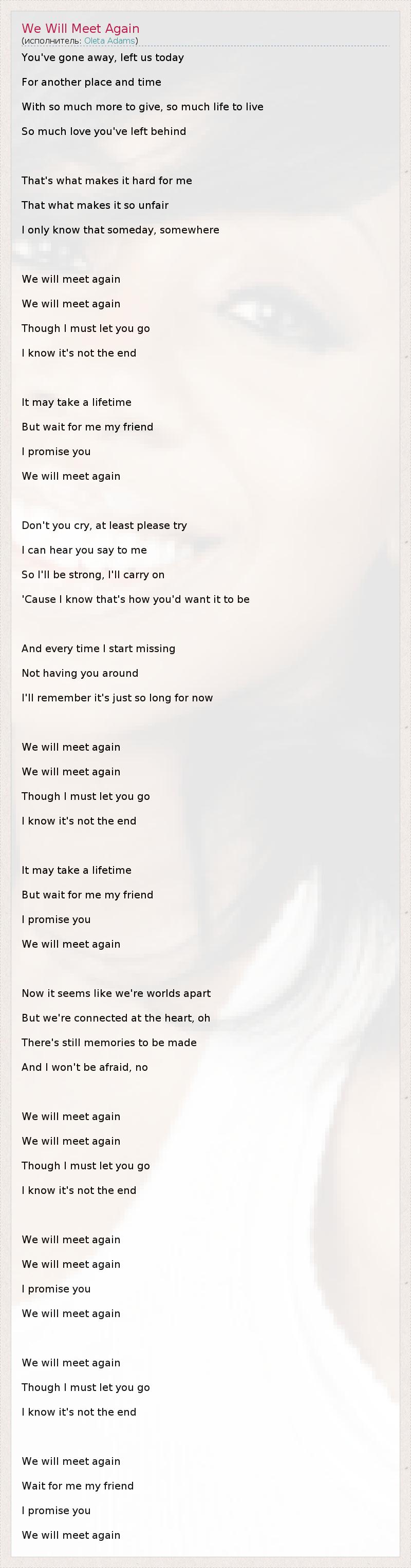 You've gone away, left us today For another place and time With so much more to give, so much life to live So much love you've left behind That's what makes it hard for me That what makes it so unfair I only know that someday, somewhere We will meet again We will meet again Though I must let you go I know it's not the end It may take a lifetime But wait for me my friend I promise you We will meet again Don't you cry, at least please try I can hear you say to me So I'll be strong, I'll carry on 'Cause I know that's how you'd want it to be And every time I start missing Not having you around I'll remember it's just so long for now We will meet again We will meet again Though I must let you go I know it's not the end It may take a lifetime But wait for me my friend I promise you We will meet again Now it seems like we're worlds apart But we're connected at the heart, oh There's still memories to be made And I won't be afraid, no We will meet again We will meet again Though I must let you go I know it's not the end We will meet again We will meet again I promise you We will meet again We will meet again Though I must let you go I know it's not the end We will meet again Wait for me my friend I promise you We will meet again