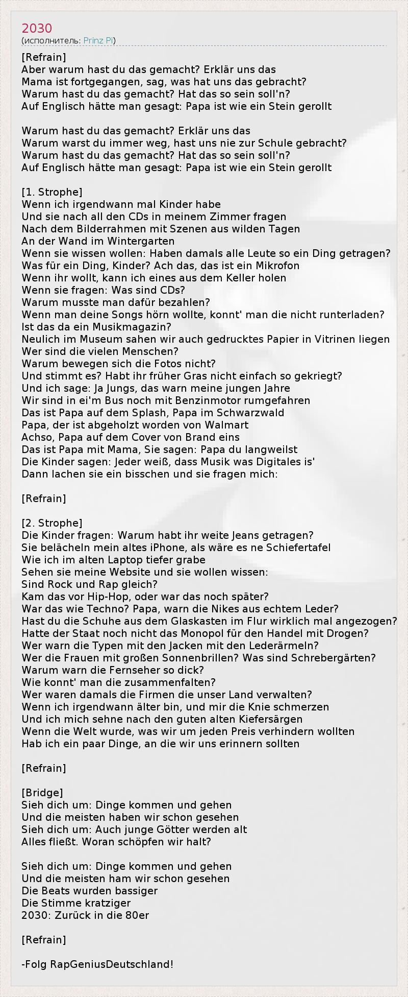 [Refrain] Aber warum hast du das gemacht? Erklär uns das Mama ist fortgegangen, sag, was hat uns das gebracht? Warum hast du das gemacht? Hat das so sein soll'n? Auf Englisch hätte man gesagt: Papa ist wie ein Stein gerollt Warum hast du das gemacht? Erklär uns das Warum warst du immer weg, hast uns nie zur Schule gebracht? Warum hast du das gemacht? Hat das so sein soll'n? Auf Englisch hätte man gesagt: Papa ist wie ein Stein gerollt [1. Strophe] Wenn ich irgendwann mal Kinder habe Und sie nach all den CDs in meinem Zimmer fragen Nach dem Bilderrahmen mit Szenen aus wilden Tagen An der Wand im Wintergarten Wenn sie wissen wollen: Haben damals alle Leute so ein Ding getragen? Was für ein Ding, Kinder? Ach das, das ist ein Mikrofon Wenn ihr wollt, kann ich eines aus dem Keller holen Wenn sie fragen: Was sind CDs? Warum musste man dafür bezahlen? Wenn man deine Songs hörn wollte, konnt' man die nicht runterladen? Ist das da ein Musikmagazin? Neulich im Museum sahen wir auch gedrucktes Papier in Vitrinen liegen Wer sind die vielen Menschen? Warum bewegen sich die Fotos nicht? Und stimmt es? Habt ihr früher Gras nicht einfach so gekriegt? Und ich sage: Ja Jungs, das warn meine jungen Jahre Wir sind in ei'm Bus noch mit Benzinmotor rumgefahren Das ist Papa auf dem Splash, Papa im Schwarzwald Papa, der ist abgeholzt worden von Walmart Achso, Papa auf dem Cover von Brand eins Das ist Papa mit Mama, Sie sagen: Papa du langweilst Die Kinder sagen: Jeder weiß, dass Musik was Digitales is' Dann lachen sie ein bisschen und sie fragen mich: [Refrain] [2. Strophe] Die Kinder fragen: Warum habt ihr weite Jeans getragen? Sie belächeln mein altes iPhone, als wäre es ne Schiefertafel Wie ich im alten Laptop tiefer grabe Sehen sie meine Website und sie wollen wissen: Sind Rock und Rap gleich? Kam das vor Hip-Hop, oder war das noch später? War das wie Techno? Papa, warn die Nikes aus echtem Leder? Hast du die Schuhe aus dem Glaskasten im Flur wirklich mal angezogen? Hatte der Staat noch nicht das Monopol für den Handel mit Drogen? Wer warn die Typen mit den Jacken mit den Lederärmeln? Wer die Frauen mit großen Sonnenbrillen? Was sind Schrebergärten? Warum warn die Fernseher so dick? Wie konnt' man die zusammenfalten? Wer waren damals die Firmen die unser Land verwalten? Wenn ich irgendwann älter bin, und mir die Knie schmerzen Und ich mich sehne nach den guten alten Kiefersärgen Wenn die Welt wurde, was wir um jeden Preis verhindern wollten Hab ich ein paar Dinge, an die wir uns erinnern sollten [Refrain] [Bridge] Sieh dich um: Dinge kommen und gehen Und die meisten haben wir schon gesehen Sieh dich um: Auch junge Götter werden alt Alles fließt. Woran schöpfen wir halt? Sieh dich um: Dinge kommen und gehen Und die meisten ham wir schon gesehen Die Beats wurden bassiger Die Stimme kratziger 2030: Zurück in die 80er [Refrain] -Folg RapGeniusDeutschland!