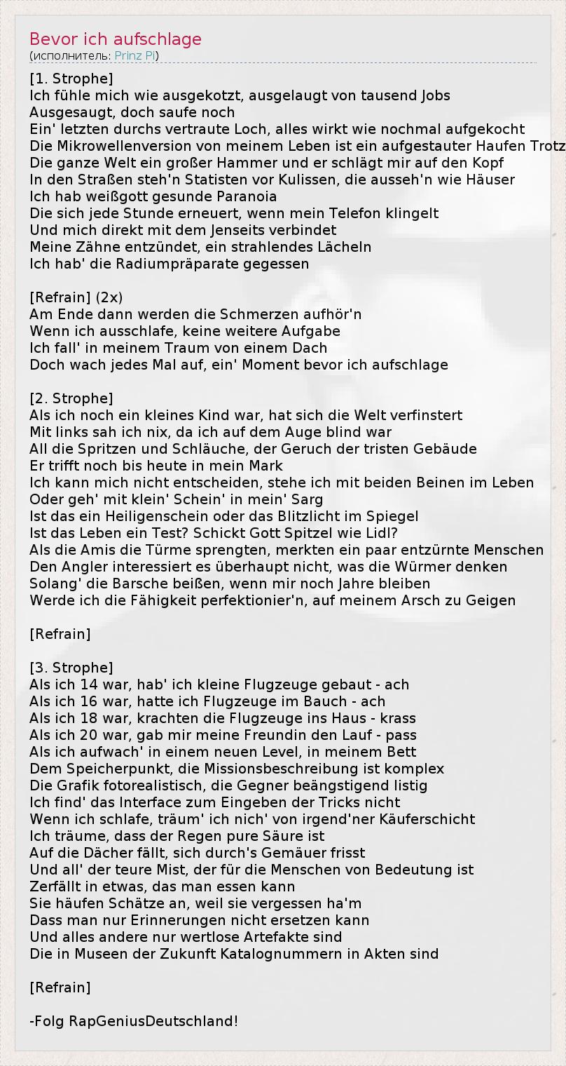 [1. Strophe] Ich fühle mich wie ausgekotzt, ausgelaugt von tausend Jobs Ausgesaugt, doch saufe noch Ein' letzten durchs vertraute Loch, alles wirkt wie nochmal aufgekocht Die Mikrowellenversion von meinem Leben ist ein aufgestauter Haufen Trotz Die ganze Welt ein großer Hammer und er schlägt mir auf den Kopf In den Straßen steh'n Statisten vor Kulissen, die ausseh'n wie Häuser Ich hab weißgott gesunde Paranoia Die sich jede Stunde erneuert, wenn mein Telefon klingelt Und mich direkt mit dem Jenseits verbindet Meine Zähne entzündet, ein strahlendes Lächeln Ich hab' die Radiumpräparate gegessen [Refrain] (2x) Am Ende dann werden die Schmerzen aufhör'n Wenn ich ausschlafe, keine weitere Aufgabe Ich fall' in meinem Traum von einem Dach Doch wach jedes Mal auf, ein' Moment bevor ich aufschlage [2. Strophe] Als ich noch ein kleines Kind war, hat sich die Welt verfinstert Mit links sah ich nix, da ich auf dem Auge blind war All die Spritzen und Schläuche, der Geruch der tristen Gebäude Er trifft noch bis heute in mein Mark Ich kann mich nicht entscheiden, stehe ich mit beiden Beinen im Leben Oder geh' mit klein' Schein' in mein' Sarg Ist das ein Heiligenschein oder das Blitzlicht im Spiegel Ist das Leben ein Test? Schickt Gott Spitzel wie Lidl? Als die Amis die Türme sprengten, merkten ein paar entzürnte Menschen Den Angler interessiert es überhaupt nicht, was die Würmer denken Solang' die Barsche beißen, wenn mir noch Jahre bleiben Werde ich die Fähigkeit perfektionier'n, auf meinem Arsch zu Geigen [Refrain] [3. Strophe] Als ich 14 war, hab' ich kleine Flugzeuge gebaut - ach Als ich 16 war, hatte ich Flugzeuge im Bauch - ach Als ich 18 war, krachten die Flugzeuge ins Haus - krass Als ich 20 war, gab mir meine Freundin den Lauf - pass Als ich aufwach' in einem neuen Level, in meinem Bett Dem Speicherpunkt, die Missionsbeschreibung ist komplex Die Grafik fotorealistisch, die Gegner beängstigend listig Ich find' das Interface zum Eingeben der Tricks nicht Wenn ich schlafe, träum' ich nich' von irgend'ner Käuferschicht Ich träume, dass der Regen pure Säure ist Auf die Dächer fällt, sich durch's Gemäuer frisst Und all' der teure Mist, der für die Menschen von Bedeutung ist Zerfällt in etwas, das man essen kann Sie häufen Schätze an, weil sie vergessen ha'm Dass man nur Erinnerungen nicht ersetzen kann Und alles andere nur wertlose Artefakte sind Die in Museen der Zukunft Katalognummern in Akten sind [Refrain] -Folg RapGeniusDeutschland!