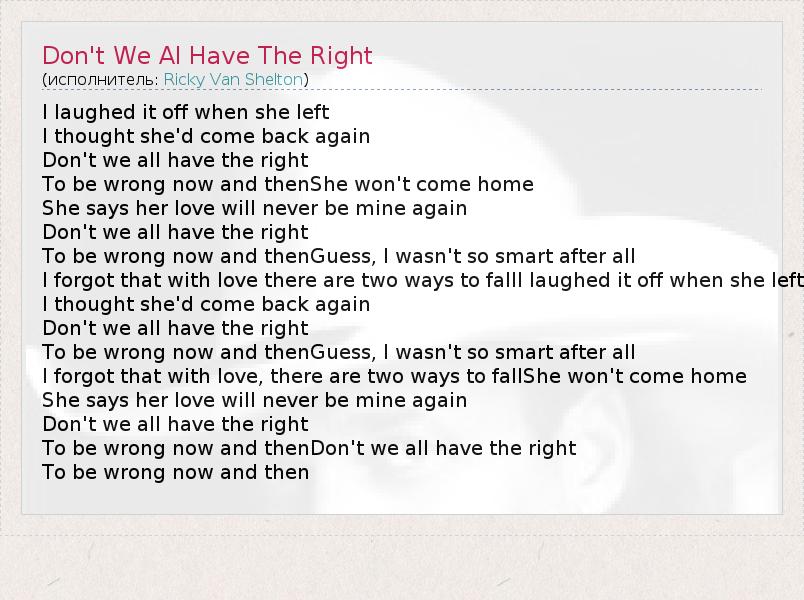 I laughed it off when she left I thought she'd come back again Don't we all have the right To be wrong now and thenShe won't come home She says her love will never be mine again Don't we all have the right To be wrong now and thenGuess, I wasn't so smart after all I forgot that with love there are two ways to fallI laughed it off when she left I thought she'd come back again Don't we all have the right To be wrong now and thenGuess, I wasn't so smart after all I forgot that with love, there are two ways to fallShe won't come home She says her love will never be mine again Don't we all have the right To be wrong now and thenDon't we all have the right To be wrong now and then
