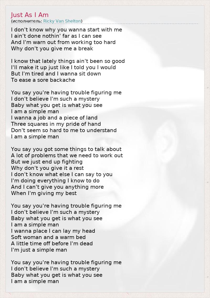 I don't know why you wanna start with me I ain't done nothin' far as I can see And I'm warn out from working too hard Why don't you give me a break I know that lately things ain't been so good I'll make it up just like I told you I would But I'm tired and I wanna sit down To ease a sore backache You say you're having trouble figuring me I don't believe I'm such a mystery Baby what you get is what you see I am a simple man I wanna a job and a piece of land Three squares in my pride of hand Don't seem so hard to me to understand I am a simple man You say you got some things to talk about A lot of problems that we need to work out But we just end up fighting Why don't you give it a rest I don't know what else I can say to you I'm doing everything I know to do And I can't give you anything more When I'm giving my best You say you're having trouble figuring me I don't believe I'm such a mystery Baby what you get is what you see I am a simple man I wanna place I can lay my head Soft woman and a warm bed A little time off before I'm dead I'm just a simple man You say you're having trouble figuring me I don't believe I'm such a mystery Baby what you get is what you see I am a simple man