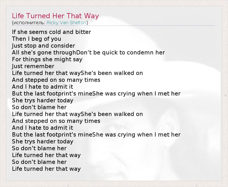 If she seems cold and bitter Then I beg of you Just stop and consider All she's gone throughDon't be quick to condemn her For things she might say Just remember Life turned her that wayShe's been walked on And stepped on so many times And I hate to admit it But the last footprint's mineShe was crying when I met her She trys harder today So don't blame her Life turned her that wayShe's been walked on And stepped on so many times And I hate to admit it But the last footprint's mineShe was crying when I met her She trys harder today So don't blame her Life turned her that way So don't blame her Life turned her that way