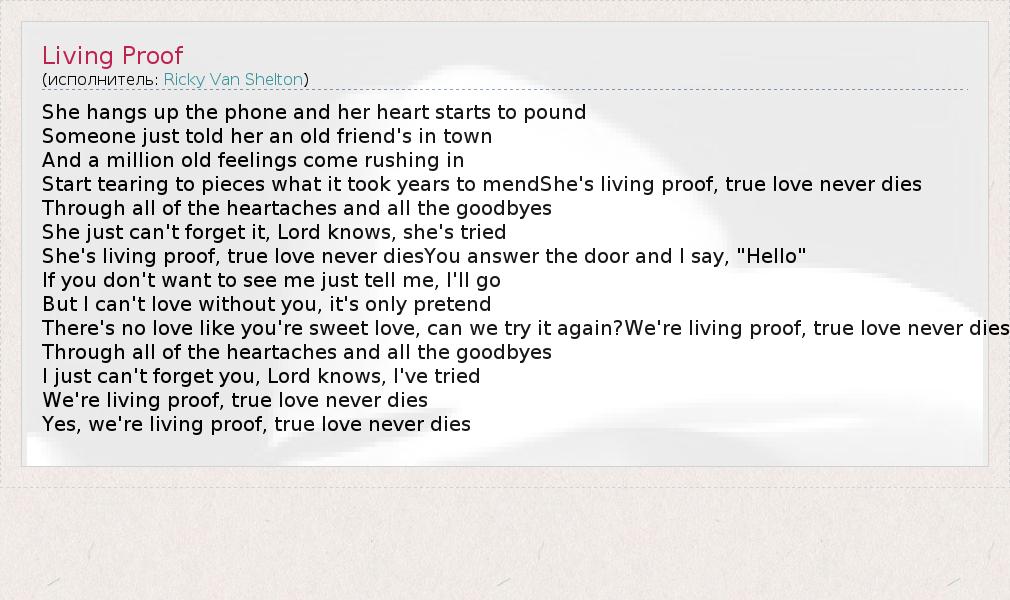 She hangs up the phone and her heart starts to pound Someone just told her an old friend's in town And a million old feelings come rushing in Start tearing to pieces what it took years to mendShe's living proof, true love never dies Through all of the heartaches and all the goodbyes She just can't forget it, Lord knows, she's tried She's living proof, true love never diesYou answer the door and I say, "Hello" If you don't want to see me just tell me, I'll go But I can't love without you, it's only pretend There's no love like you're sweet love, can we try it again?We're living proof, true love never dies Through all of the heartaches and all the goodbyes I just can't forget you, Lord knows, I've tried We're living proof, true love never dies Yes, we're living proof, true love never dies